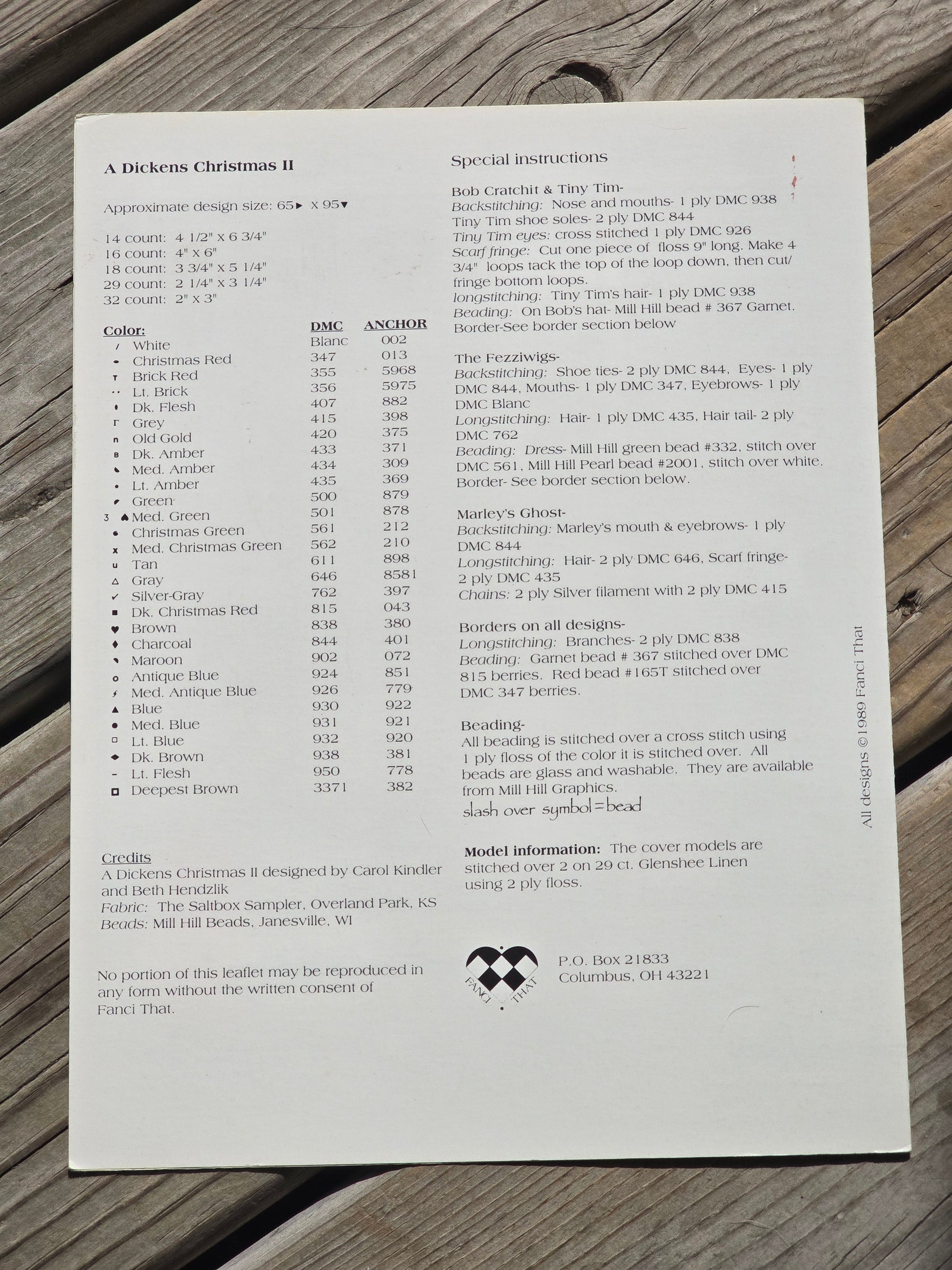 A Dickens Christmas II cross stitch pattern. Fanci That 1989. Aapproximate design size: 65 x 95. Estate find. Good condition. Mark on back cover, see photo.