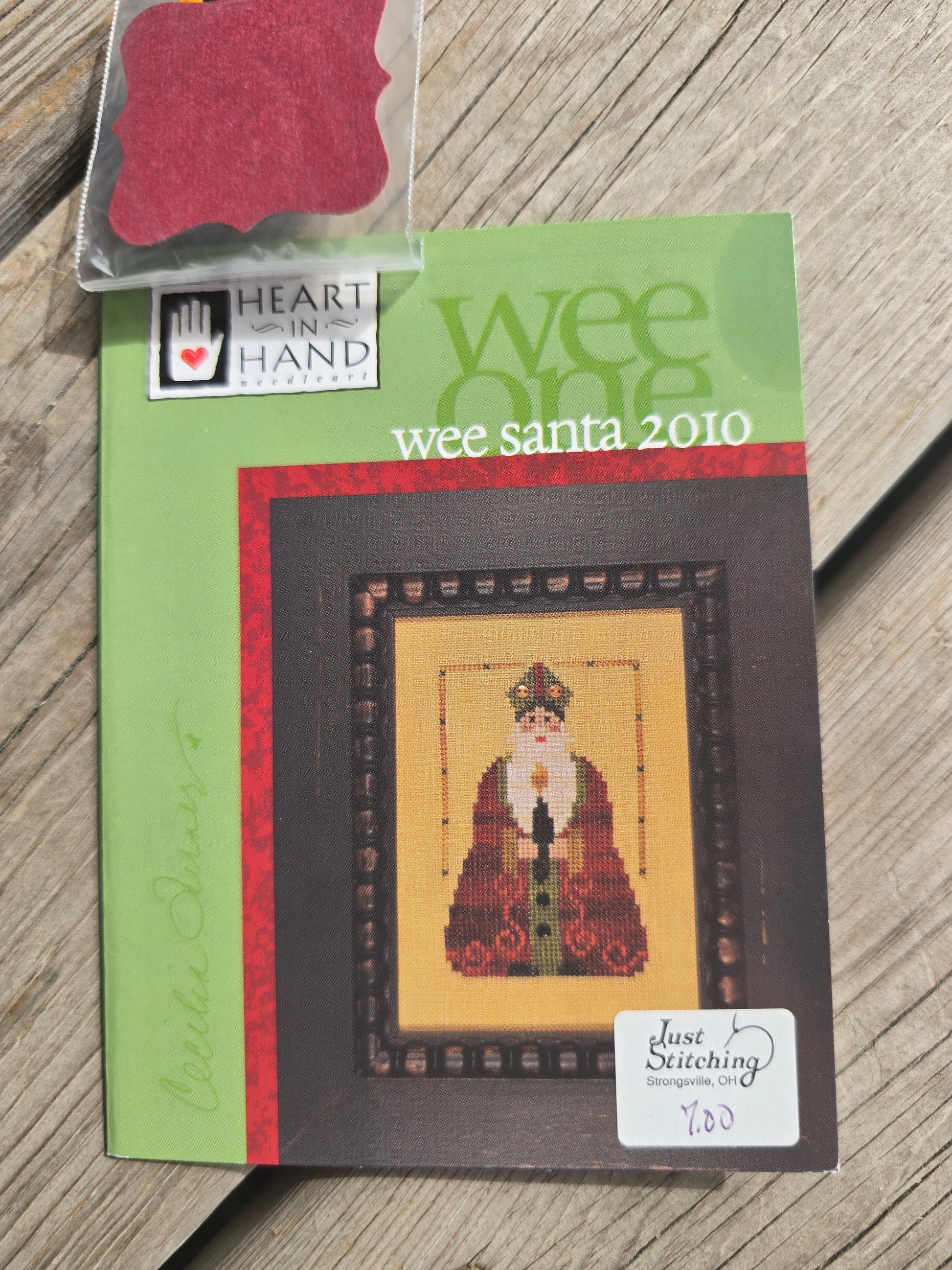 Wee Santa 2010 cross stitch pattern with buttons. Heart in Hand 2010. Stitch count: 40w x 62h. Estate find. Like new. Button package stapled to cover.