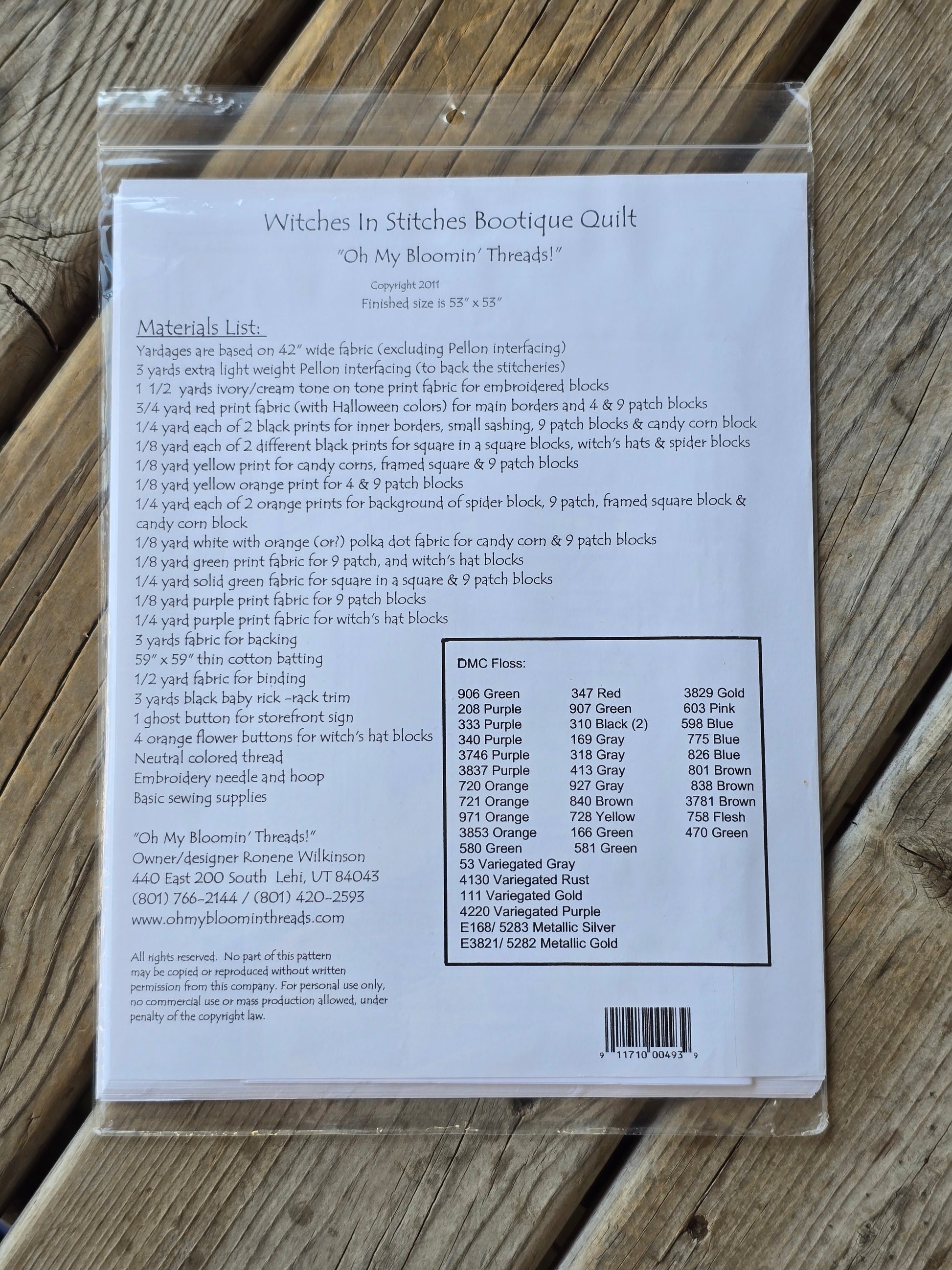 Witches in Stitches Bootique Quilt embroidery and quilt pattern. Oh My Bloomin' Threads 2011. Finished size 53" x 53". From a retired quilt shop. New in original package.