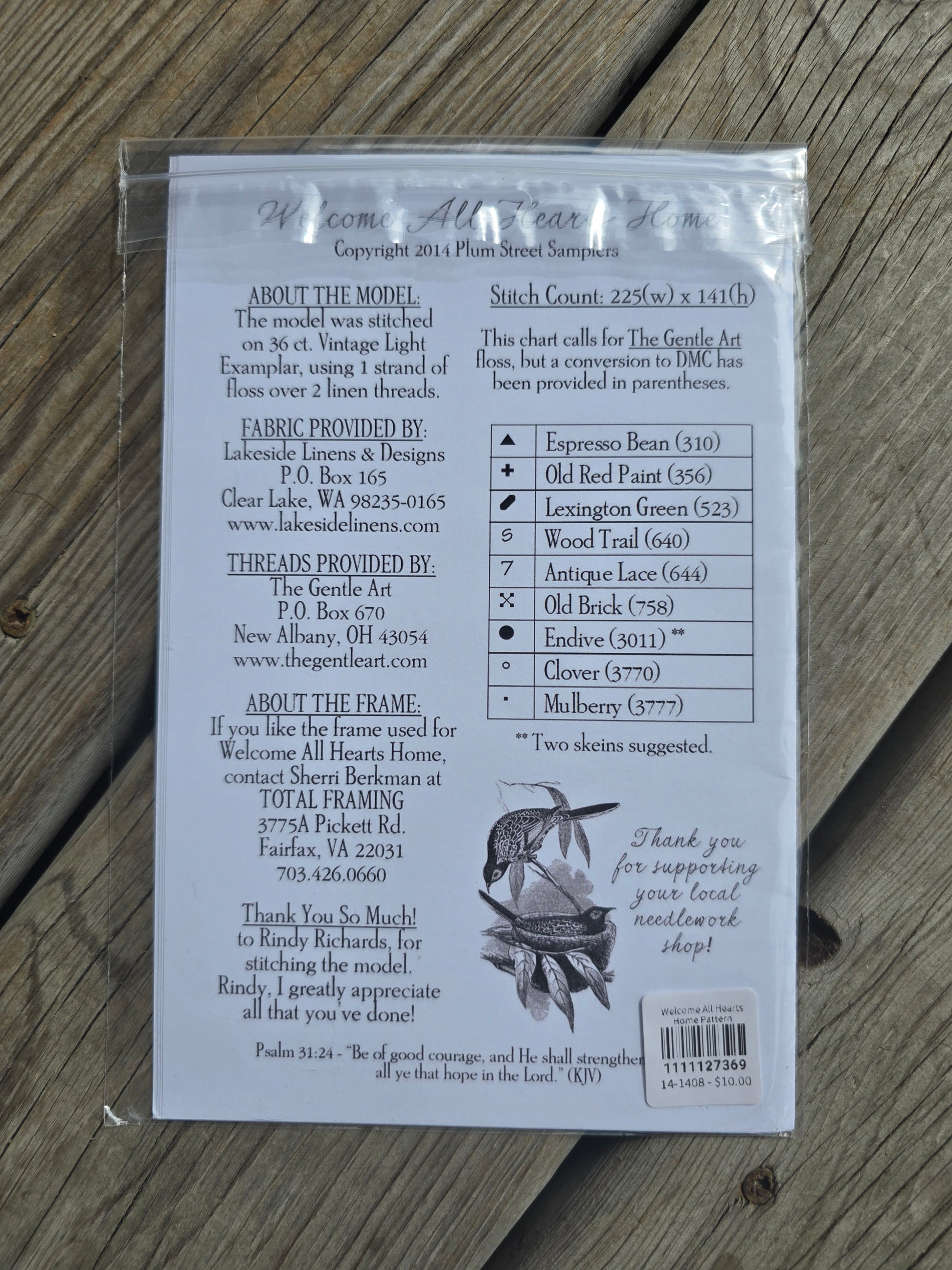 Welcome All Hearts Home cross stitch pattern. Plum Sreet Samplers 2014. Stitch count: 225w x 141h. Estate find. Like new.