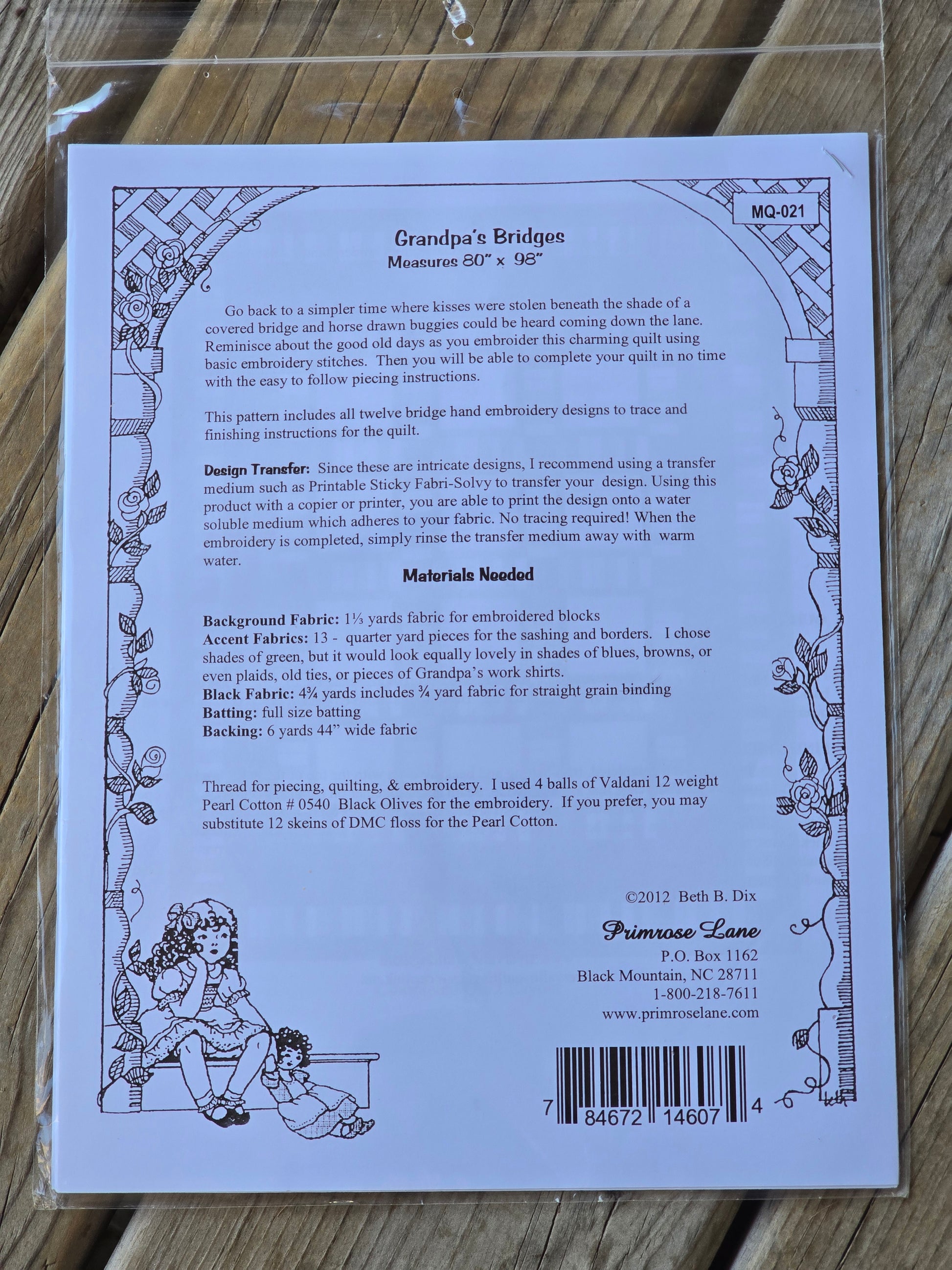 Grandpa's Bridges embroidery and quilt pattern. Primrose Lane 2012. Quilt size 80" x 98". From a retired quilt shop. New in original package.