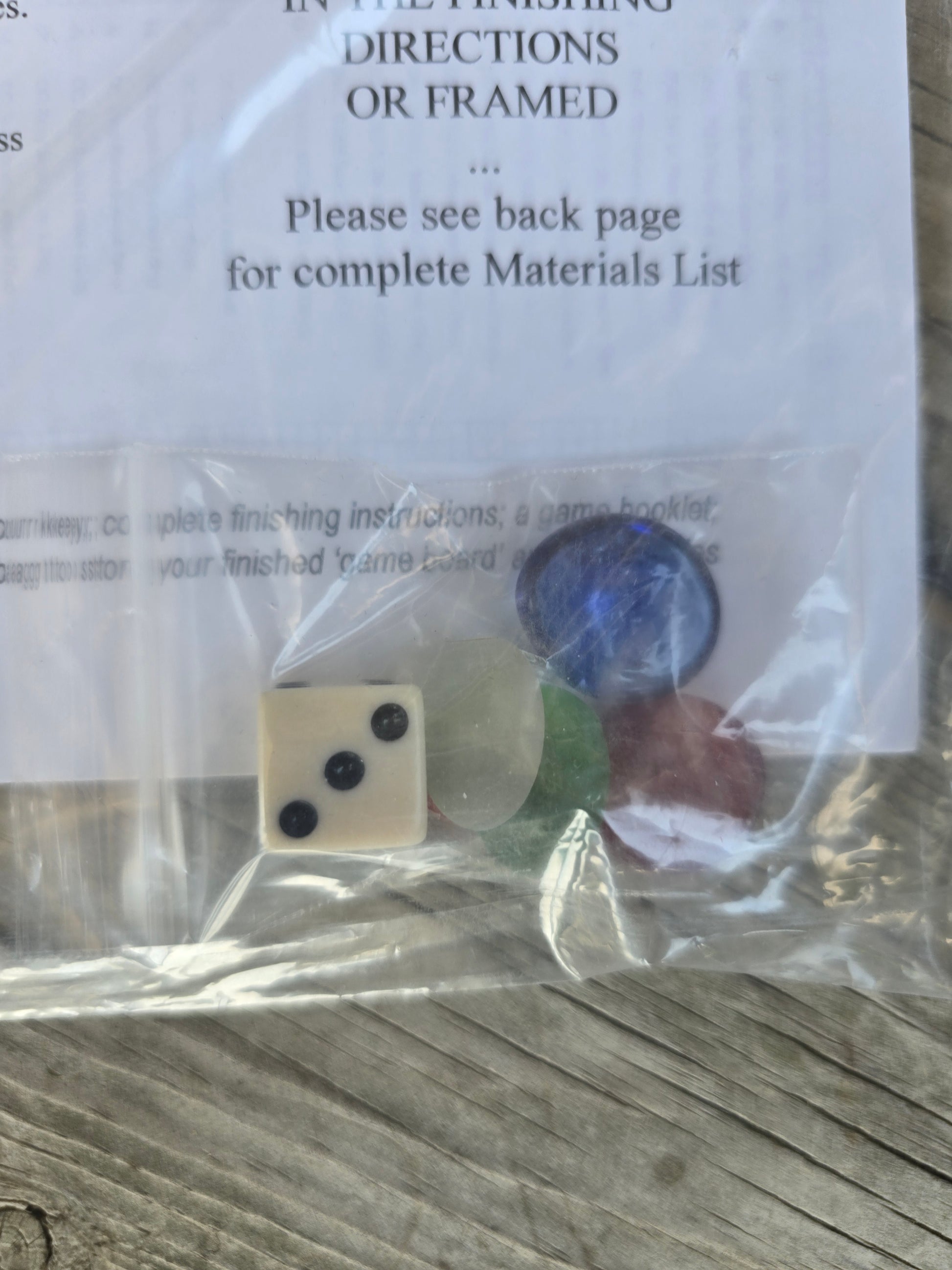 Down the Garden Path cross stitch board game chart, finishing instructions, game play booklet, 4 glass game markers, 1 dice and organza storage bag. Lynne Nicoletti. Estate find. Like new in package.
