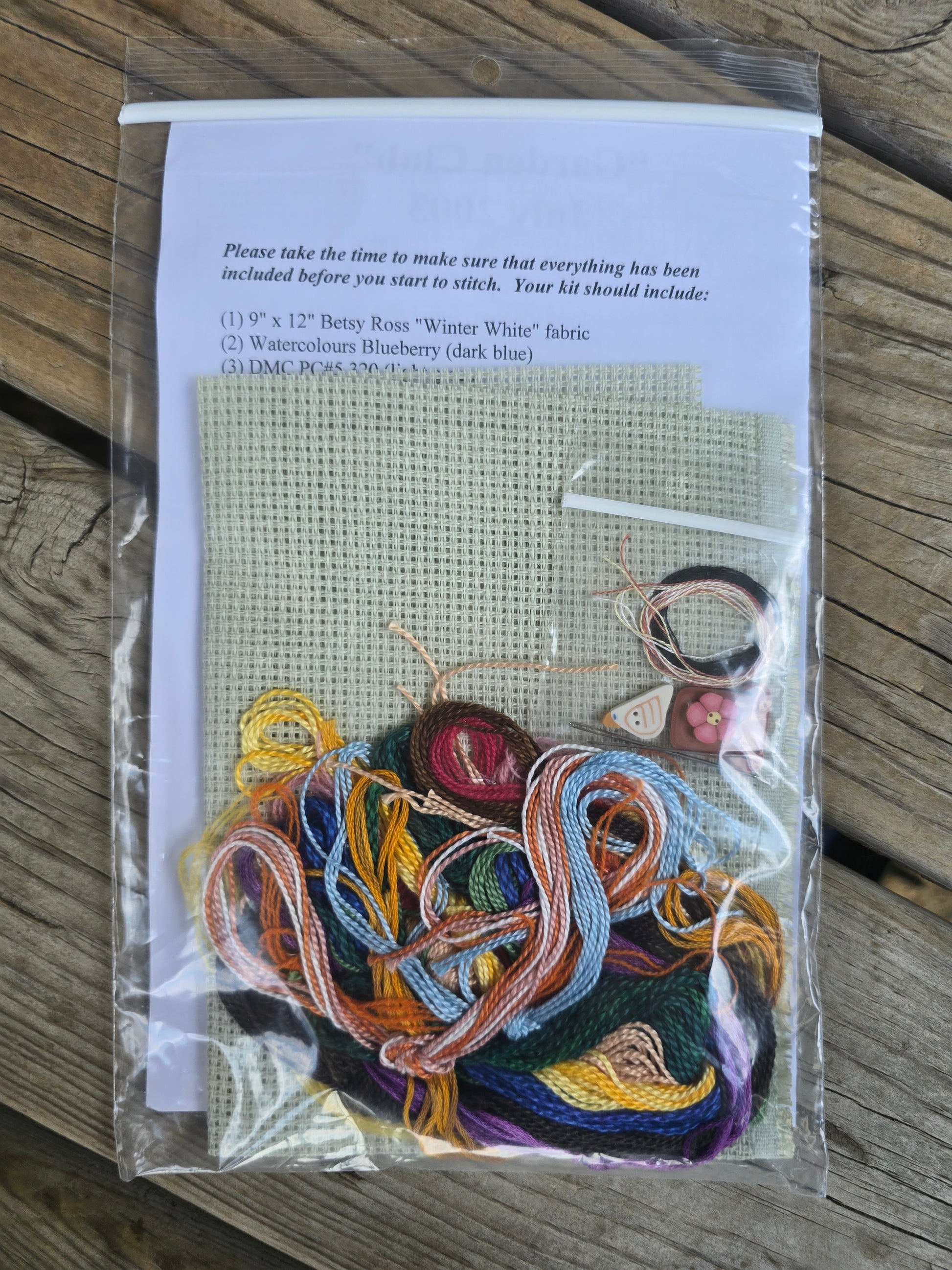 Garden Club, July 2003, cross stitch kit. Aidaworks. Kit includes chart, cloth, floss, needles and buttons. Estate find. Like new in package.
