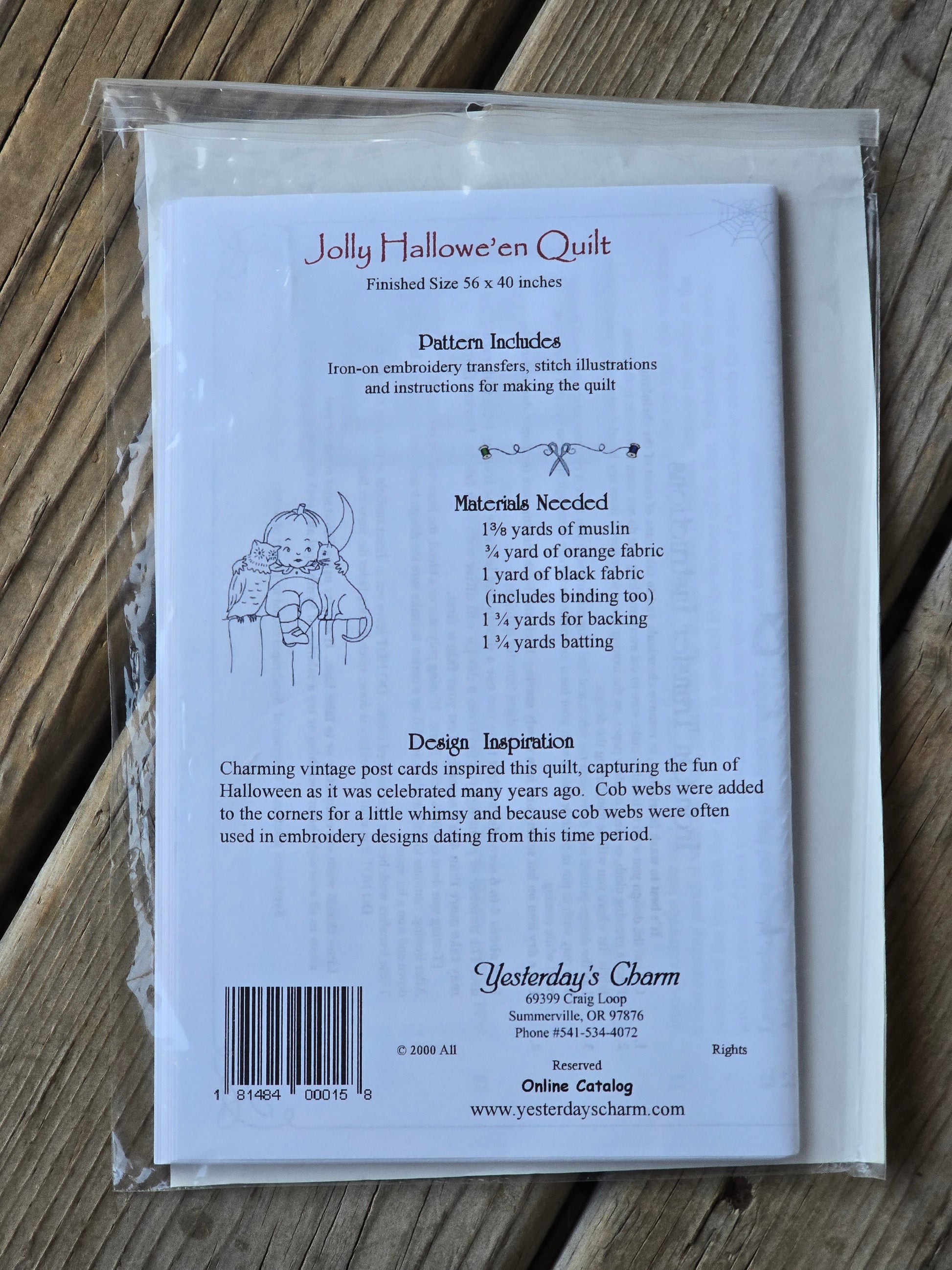 Jolly Hallowe'en Quilt embroidery and quilt pattern. Yesterday's Charm 2000. Finished size 56" x 40". Includes iron-on embroidery designs. From a retired quilt shop. New in original package.