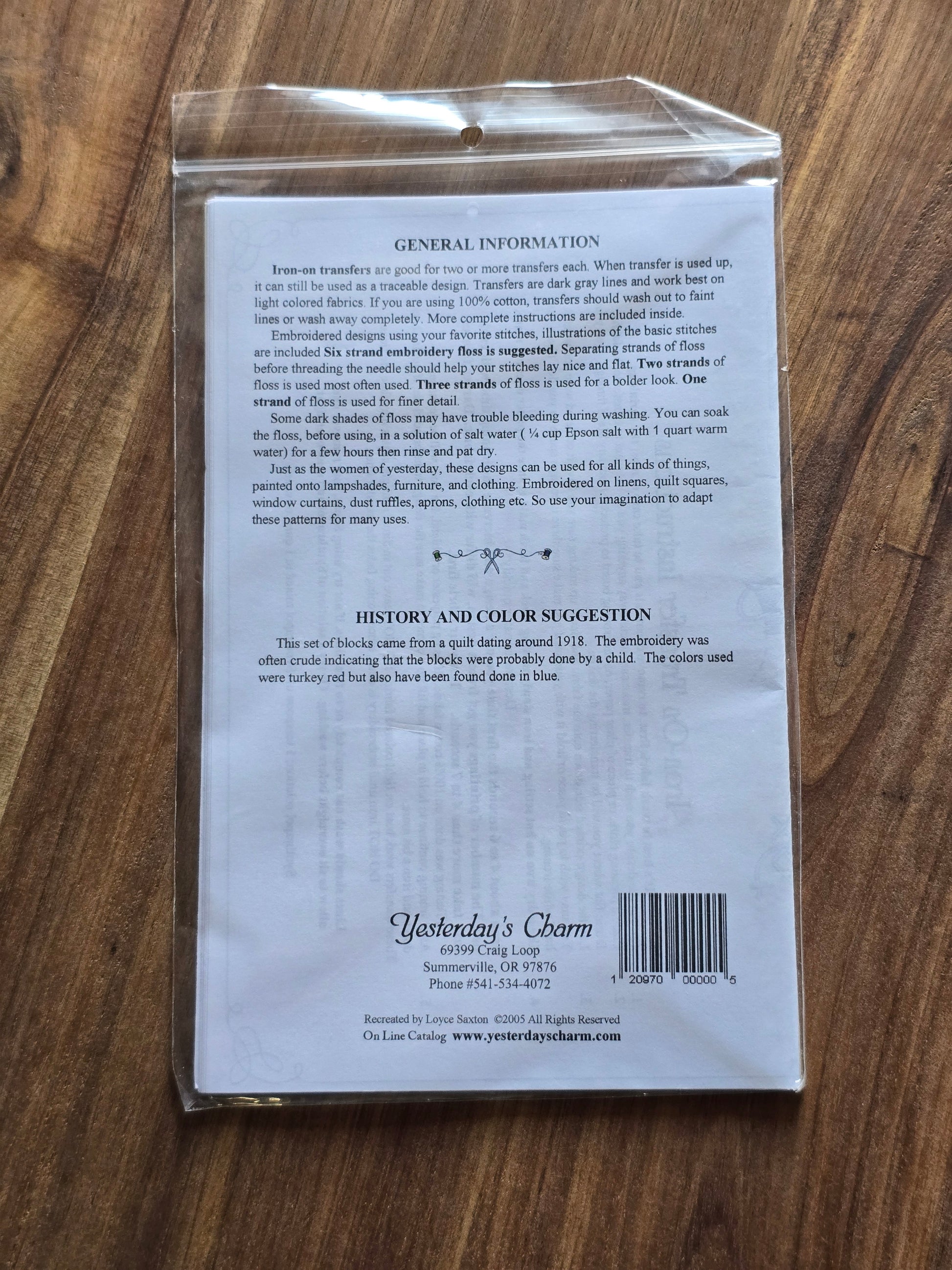 Red Riding Hood embroidery pattern. Yesterday's Charm 2005. Design size 7" tall. Includes iron-on embroidery designs. From a retired quilt shop. New in original package.
