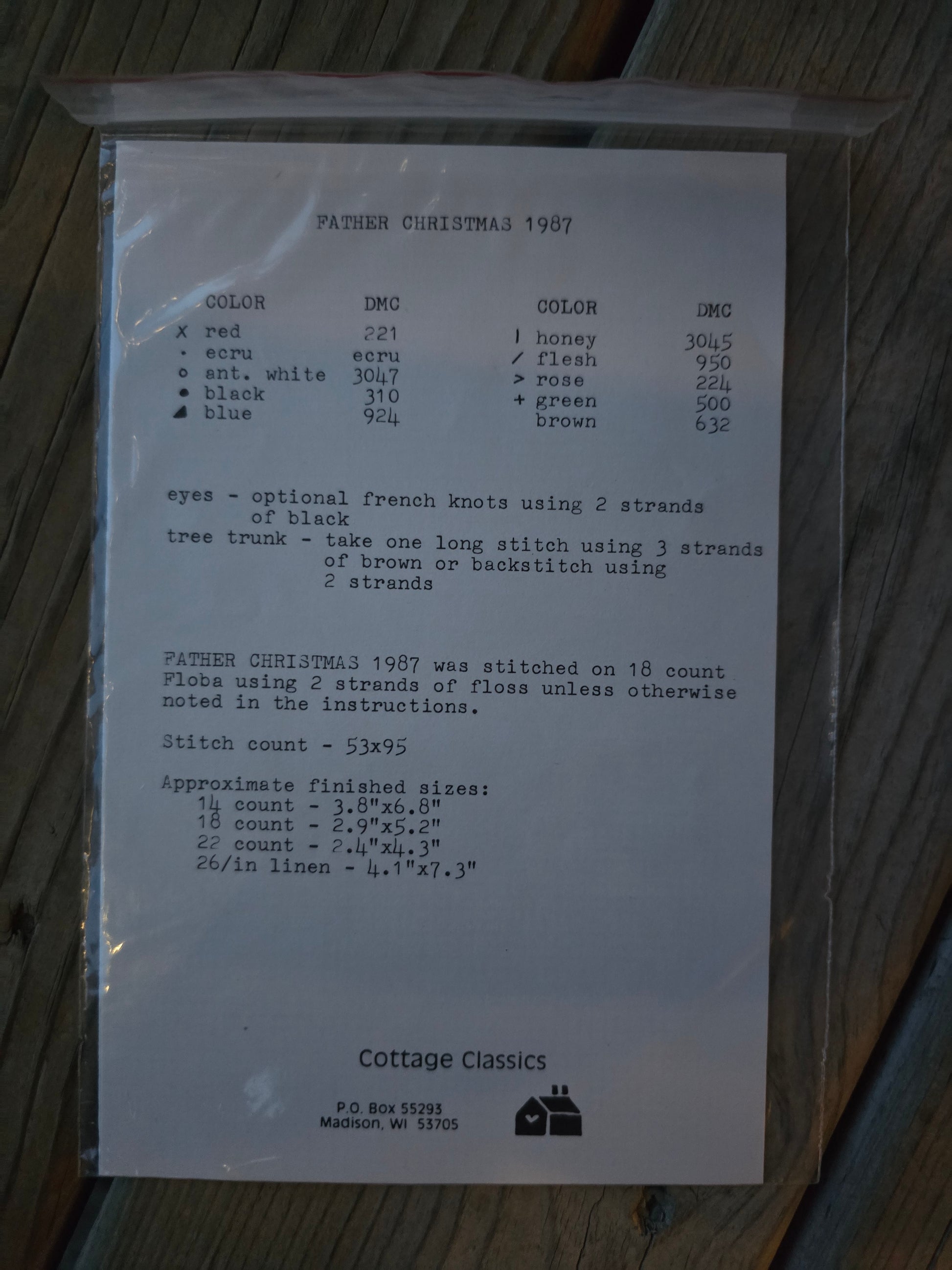 Father Christmas 1987 cross stitch pattern. Cottage Classics. Stitch count: 53 x 95. Estate find. Like new in package.