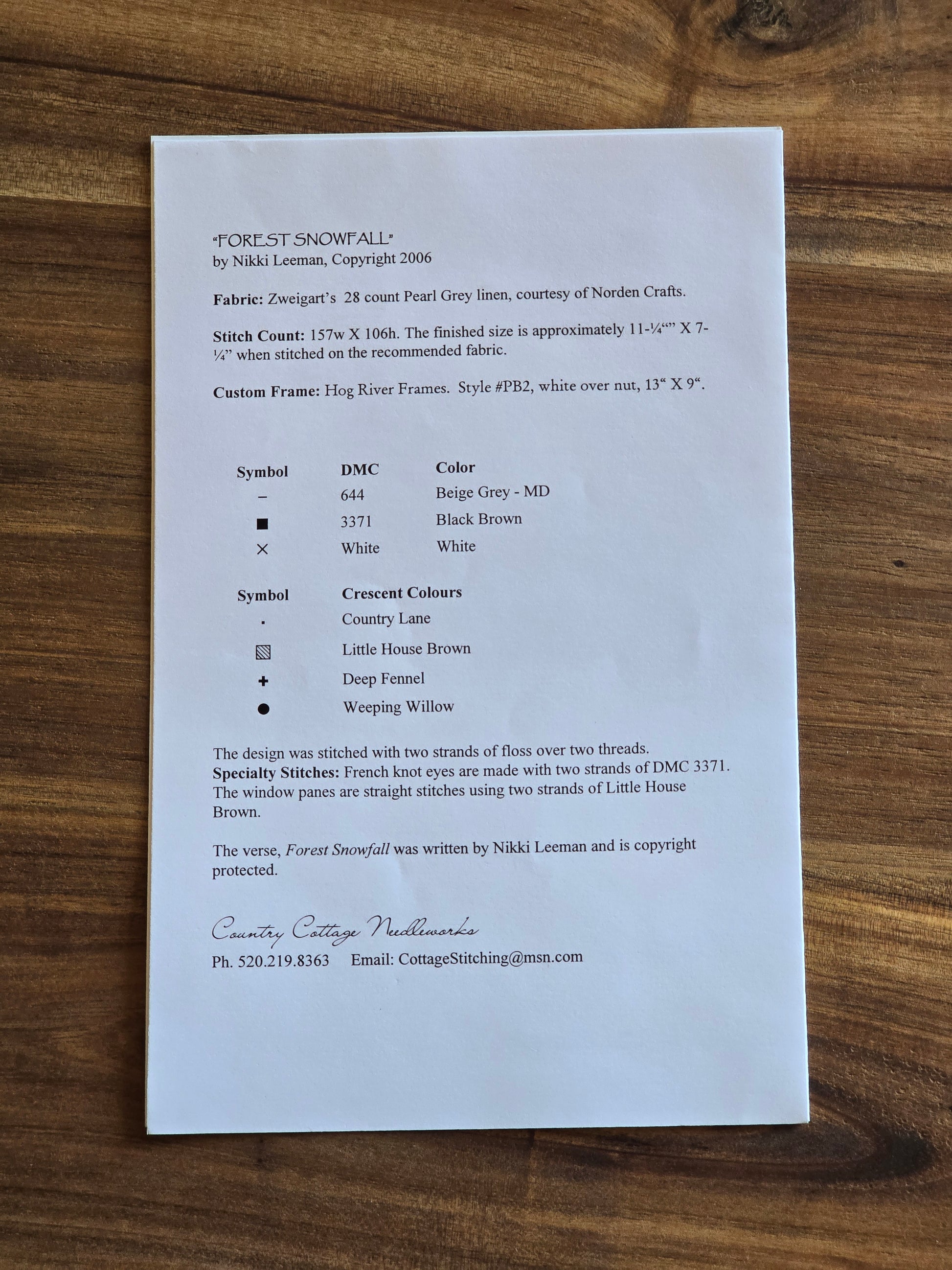 Forest Snowfall cross stitch pattern. Country Cottage Needleworks 2006. Stitch count: 157w x 106h. Estate find. Like new in original package.