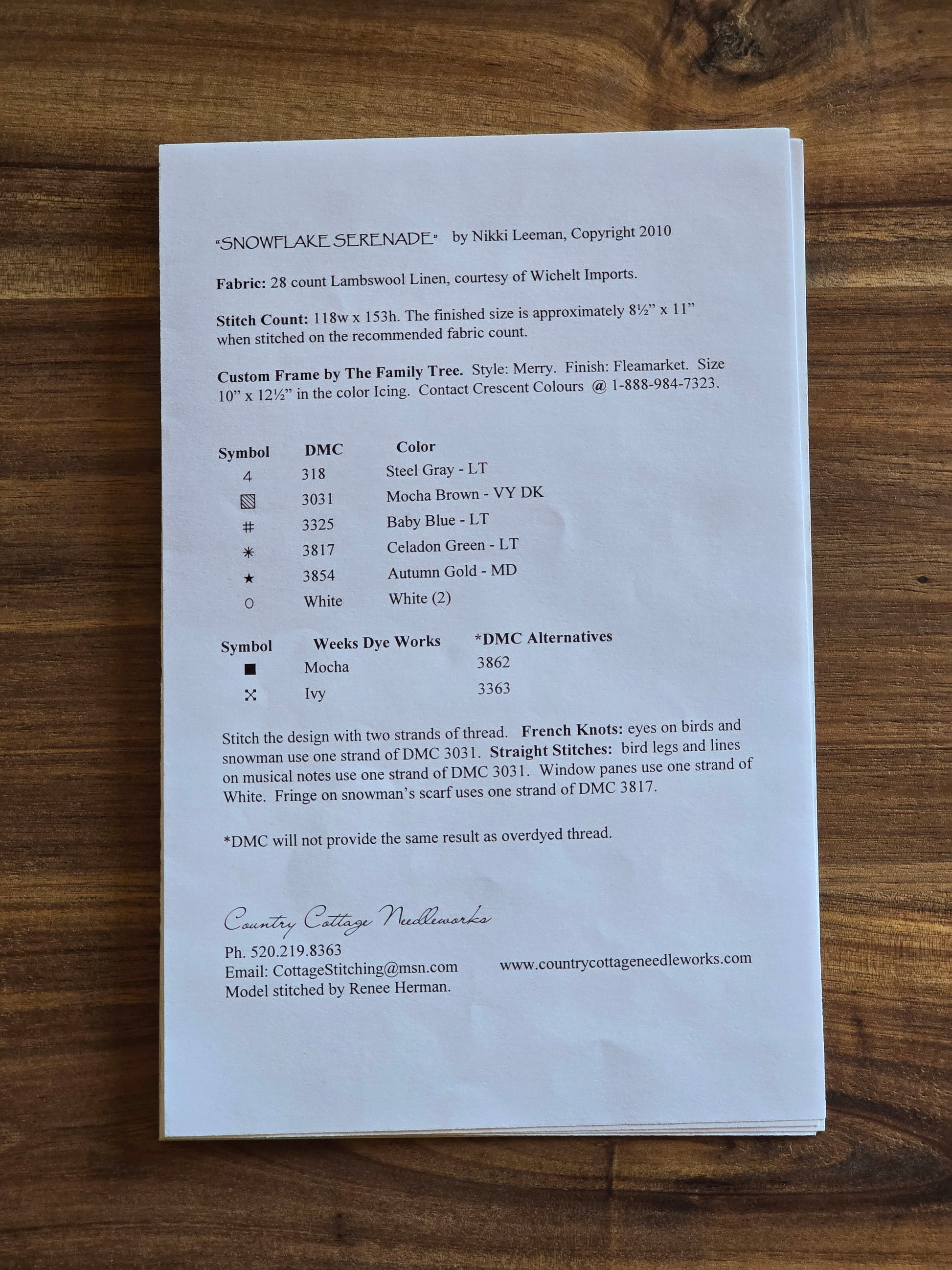 Snowflake Serenade cross stitch pattern. Country Cottage Needleworks 2010. Stitch count: 118w x 153h. Estate find. Like new in original package.