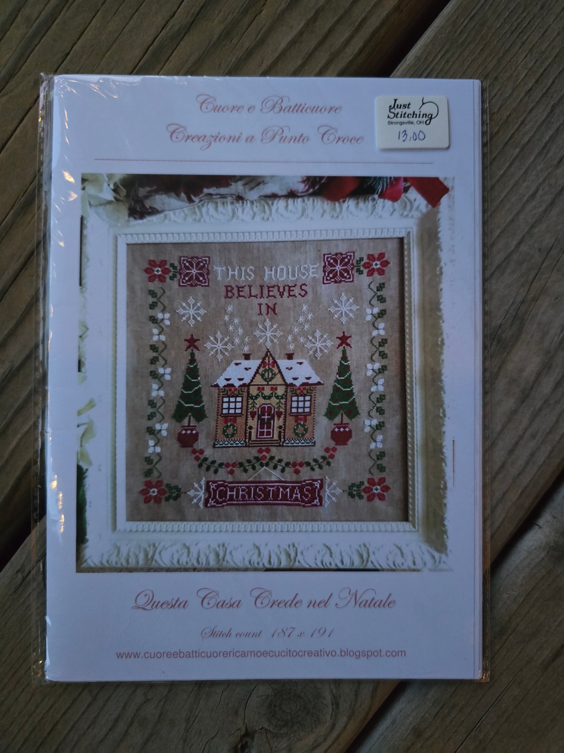 This House Believes in Christmas cross stitch pattern. Cuore e Batticuore. Stitch count: 187 x 191. Estate find. Like new in package.