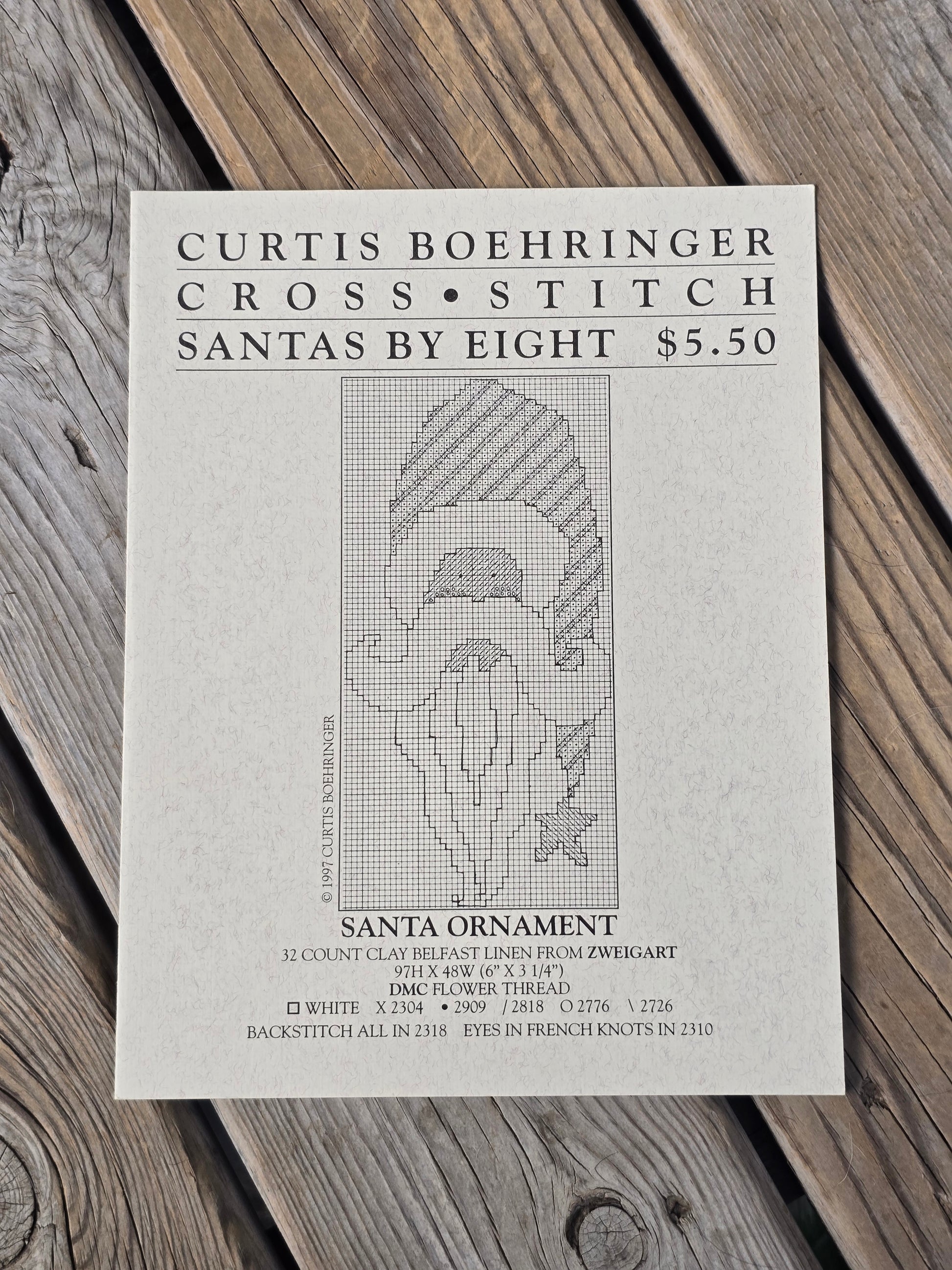 Santa Ornament cross stitch pattern. Curtis Boehringer 1997. Stitch count: varies from 87-115h x 23-34w. Estate find. Good condition. May have slight wear.