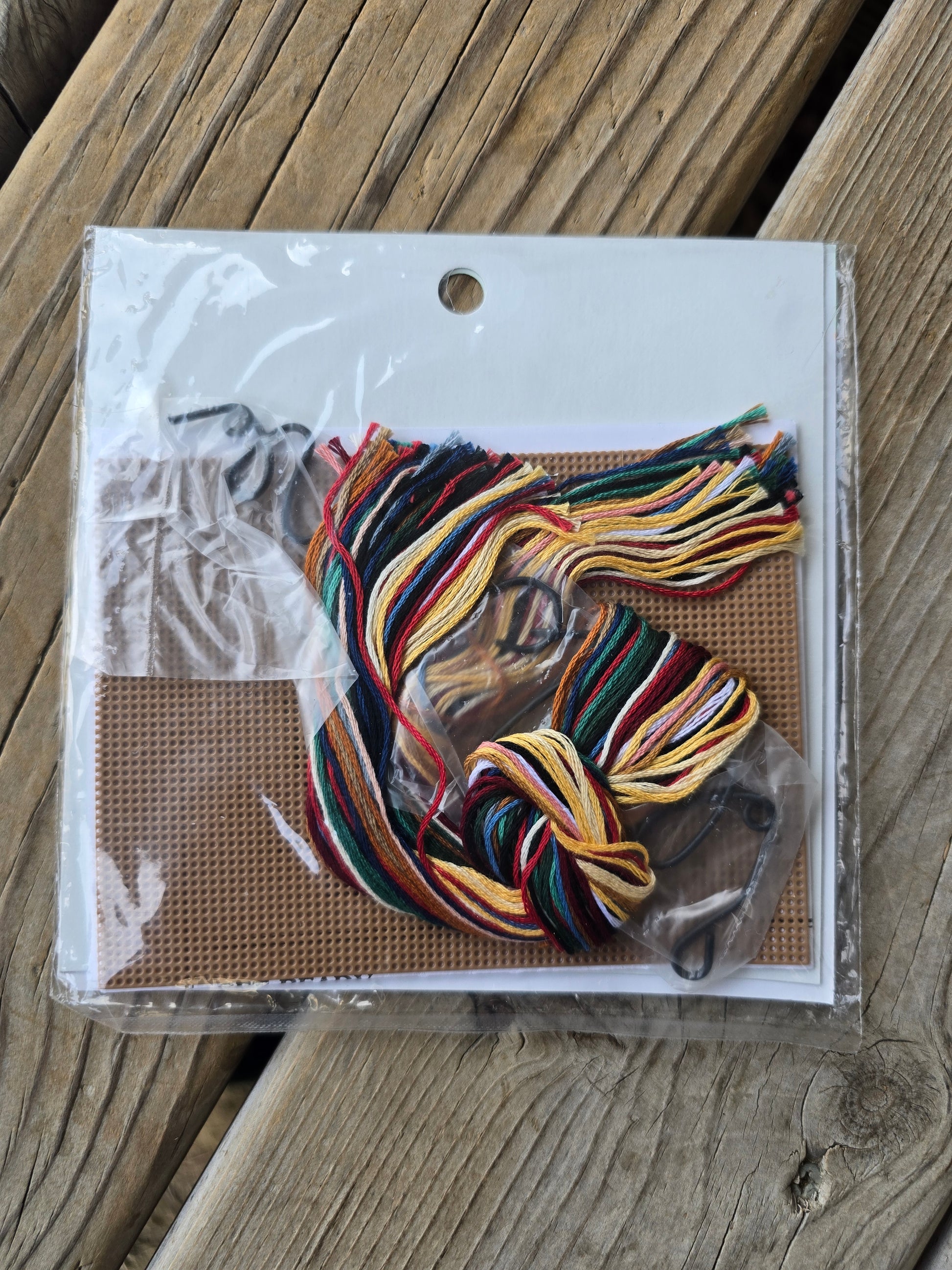 Santa's Welcome cross stitch kit designed by Debbie Mumm. Dimensions. Kit includes thread, plastic canvas, wire hanger, needle and instructions. Estate find. New in original package.