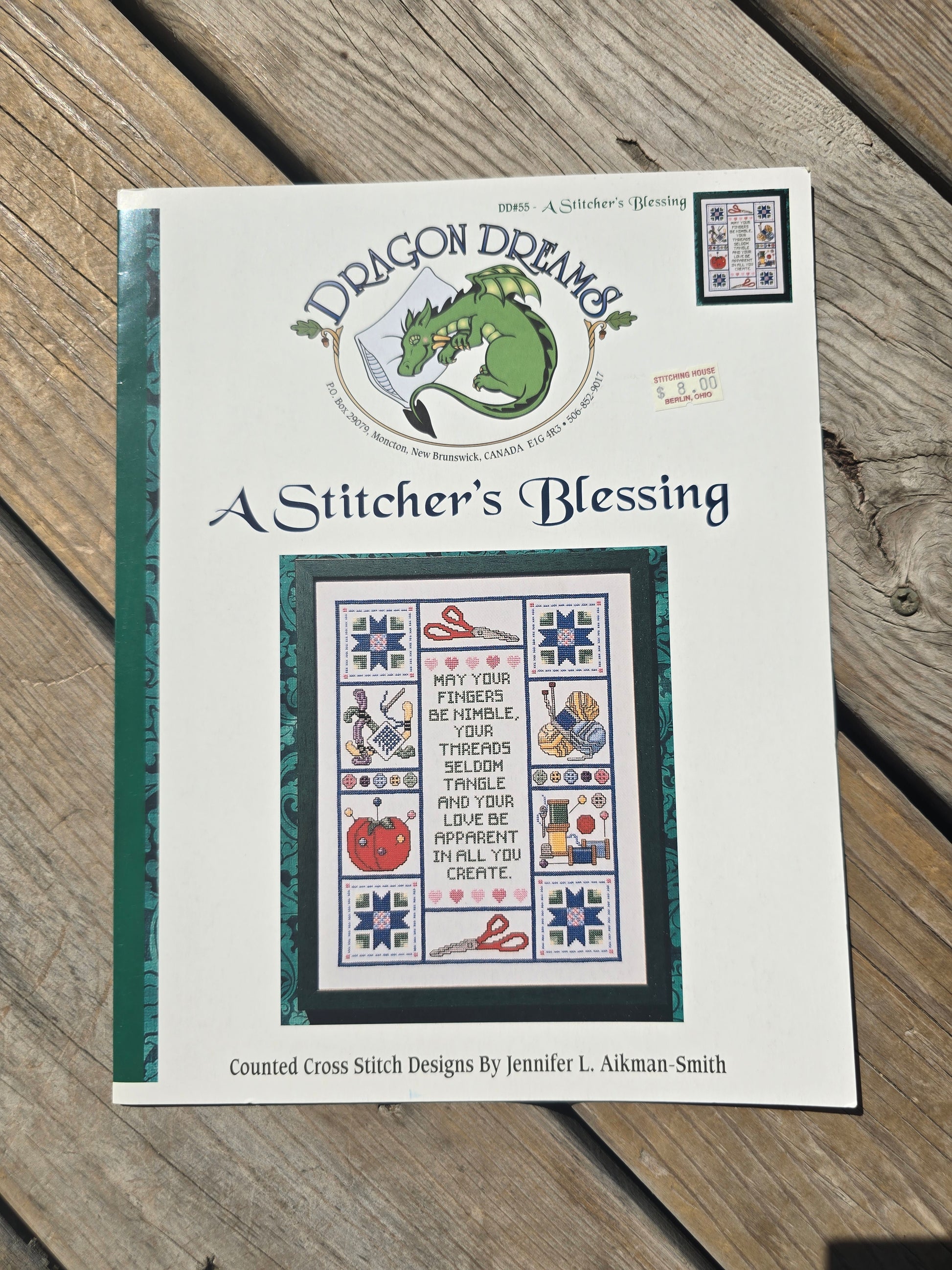 A Stitcher's Blessing cross stitch booklet. Dragon Dreams 2001. Stitch count: 145w x 187h. Estate find. Like new.
