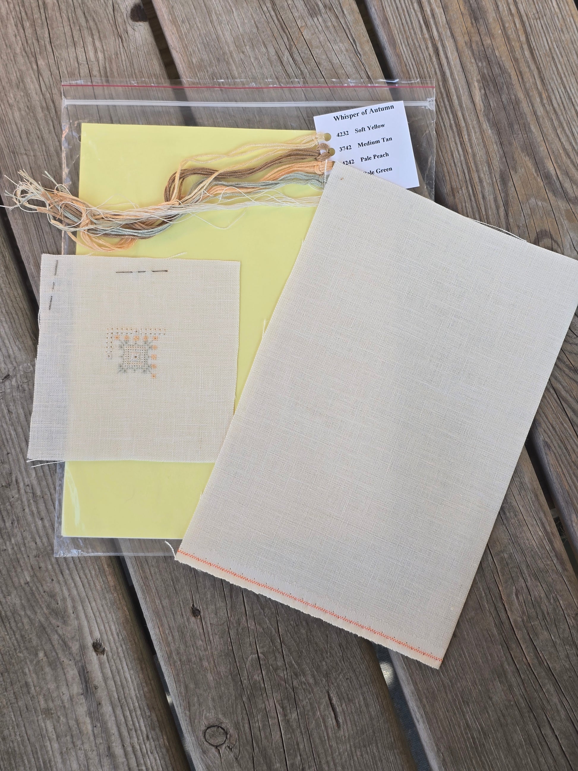 Whisper of Autumn cross stitch kit. Earth Threads 1998. Stitch count: Preface Piece 42 x 42; Whisper of Autumn 68h x 115v. Preface Piece has been started, cloth size 5.25” x 5.25”, stitched area size 1.5” x 1.75”. Blank cloth size: 14.5” x 11.25”. Kit includes pattern, floss, cloth. Needles attached to cloth are rusted. Estate find. Good condition.