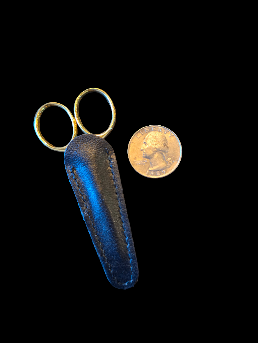 Gold handled mini embroidery scissors with sheath. Stamped Italy. Size: 2.75" long. Estate find. Like new.