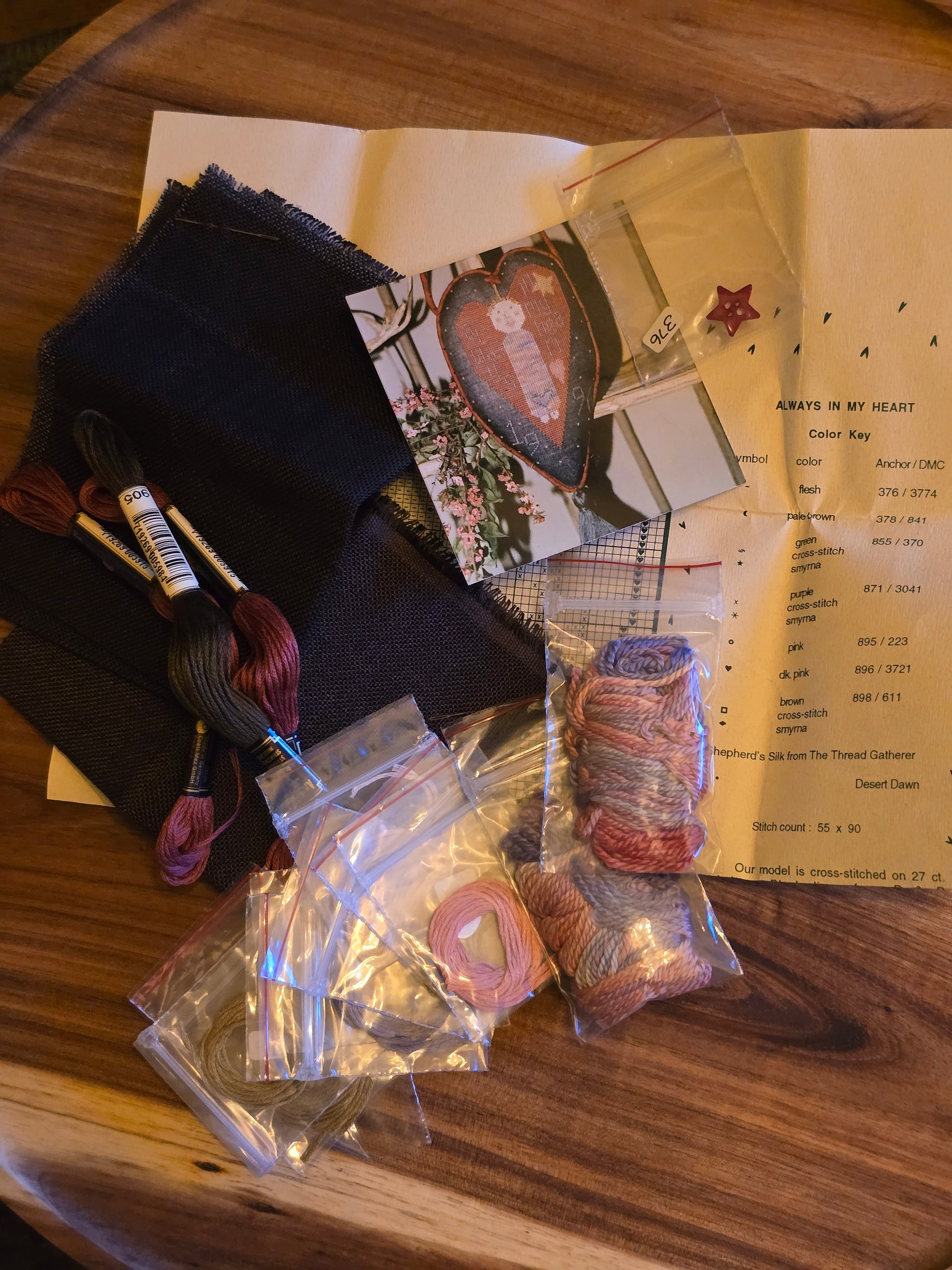 Always in my Heart cross stitch kit. Ewe and Eye and Friends 1995. Stitch count: 55 x 90. Kit includes: chart, two pieces of cloth, floss, needle and button Estate find. Used condition. Needle is rusted.