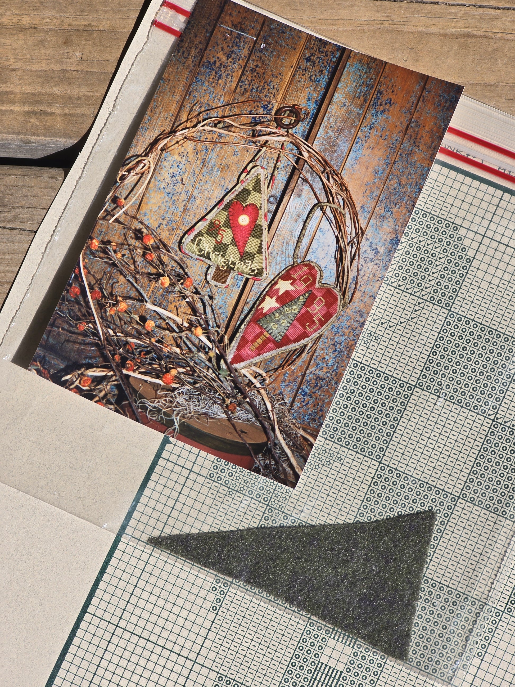 Blanket Tree Ornament cross stitch pattern with red wool heart stapled to chart. Ewe and Eye and Friends 1995. Stitch count: 84 x 61. Estate find. Good condition. Does not include button.
