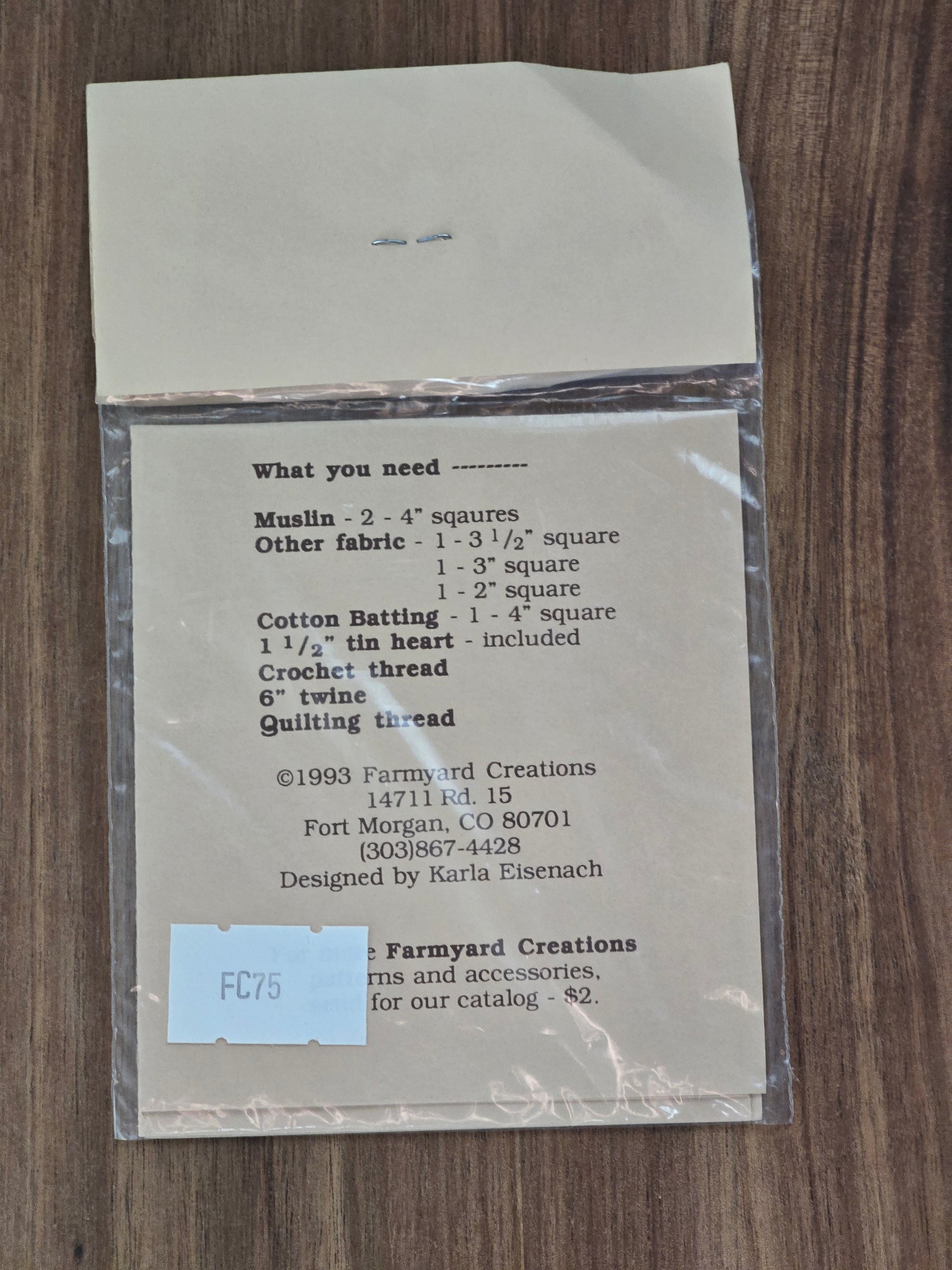 Homespun Heart quilt pattern with tin heart charm. Farmyard Creations 1993. Size: 4" square. Estate find. Like new in original unopened package.