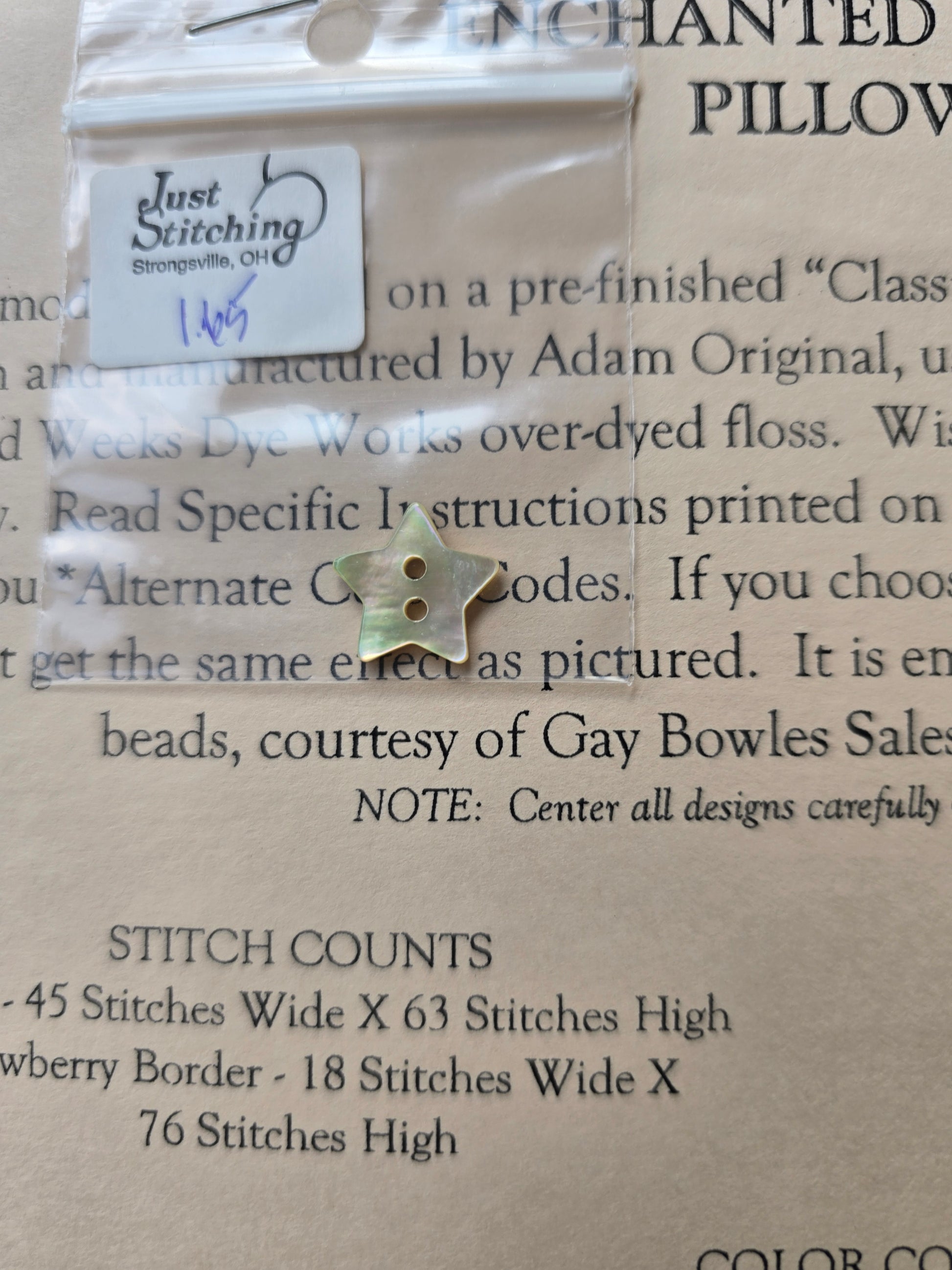 Enchanted Santa cross stitch pattern with button and pillow cover. Hollis Designs 2004. Santa stitch count: 45w x 63h. Strawberry border stitch count: 18w x 76h. Estate find. Good condition. Pillow cover like new in sealed package.