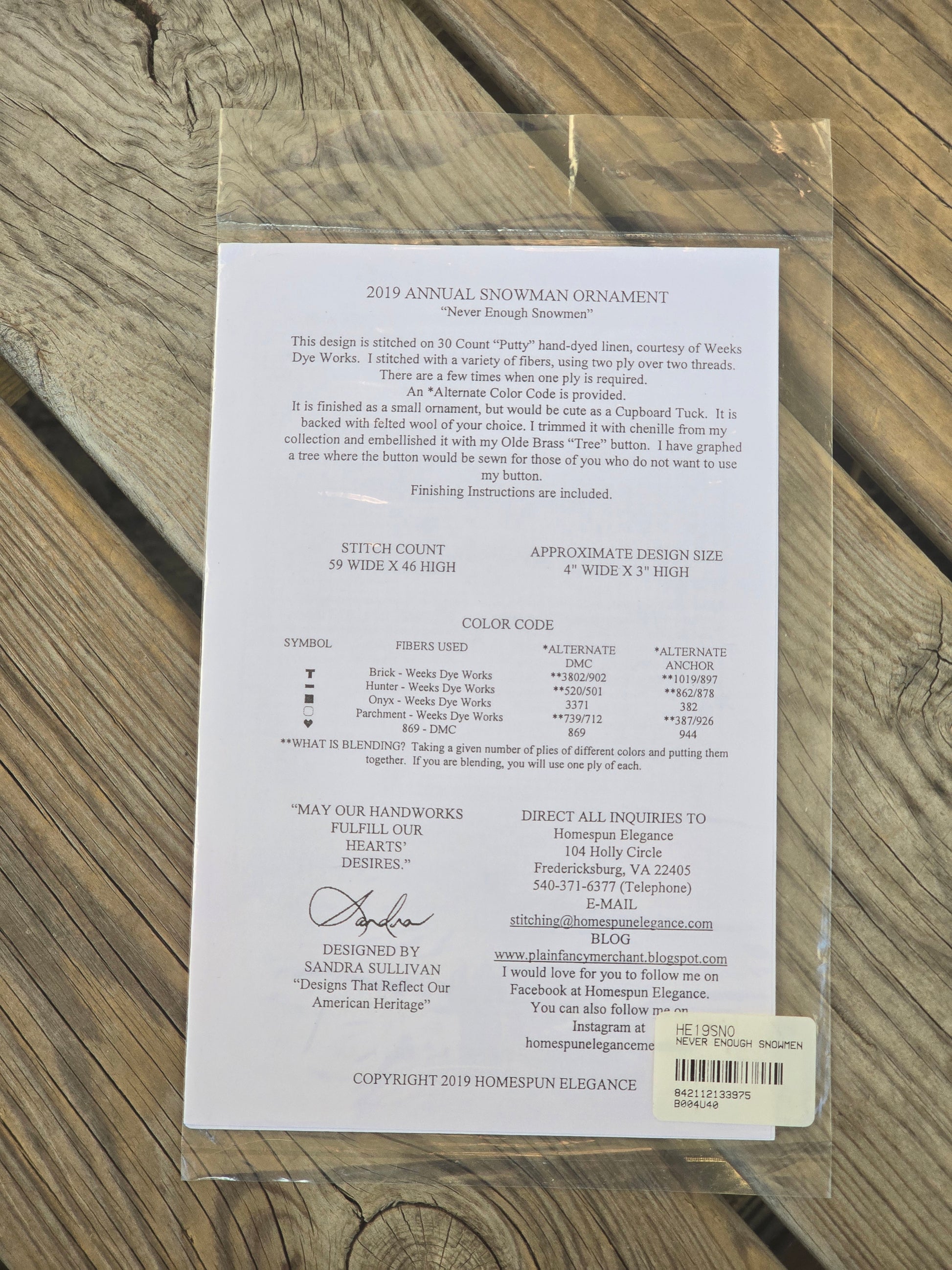 Homespun Elegance - 2019 Snowman Ornament - Never Enough Snowmen - Cross Stitch Pattern