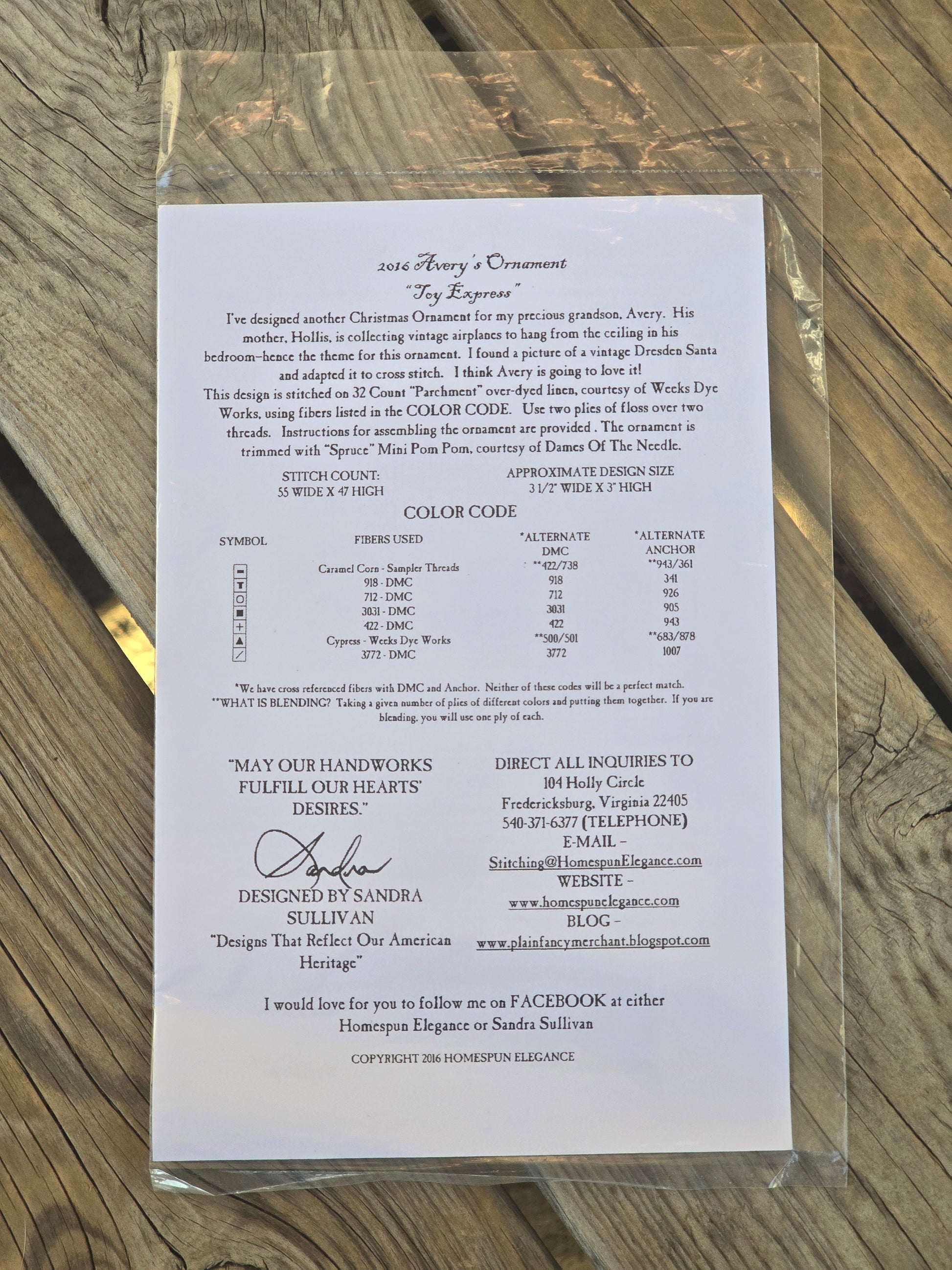 Avery's Toy Express cross stitch pattern. Homespun Elegance 2016. Stitch count: 55w x 47h. Estate find. Sealed in original package.