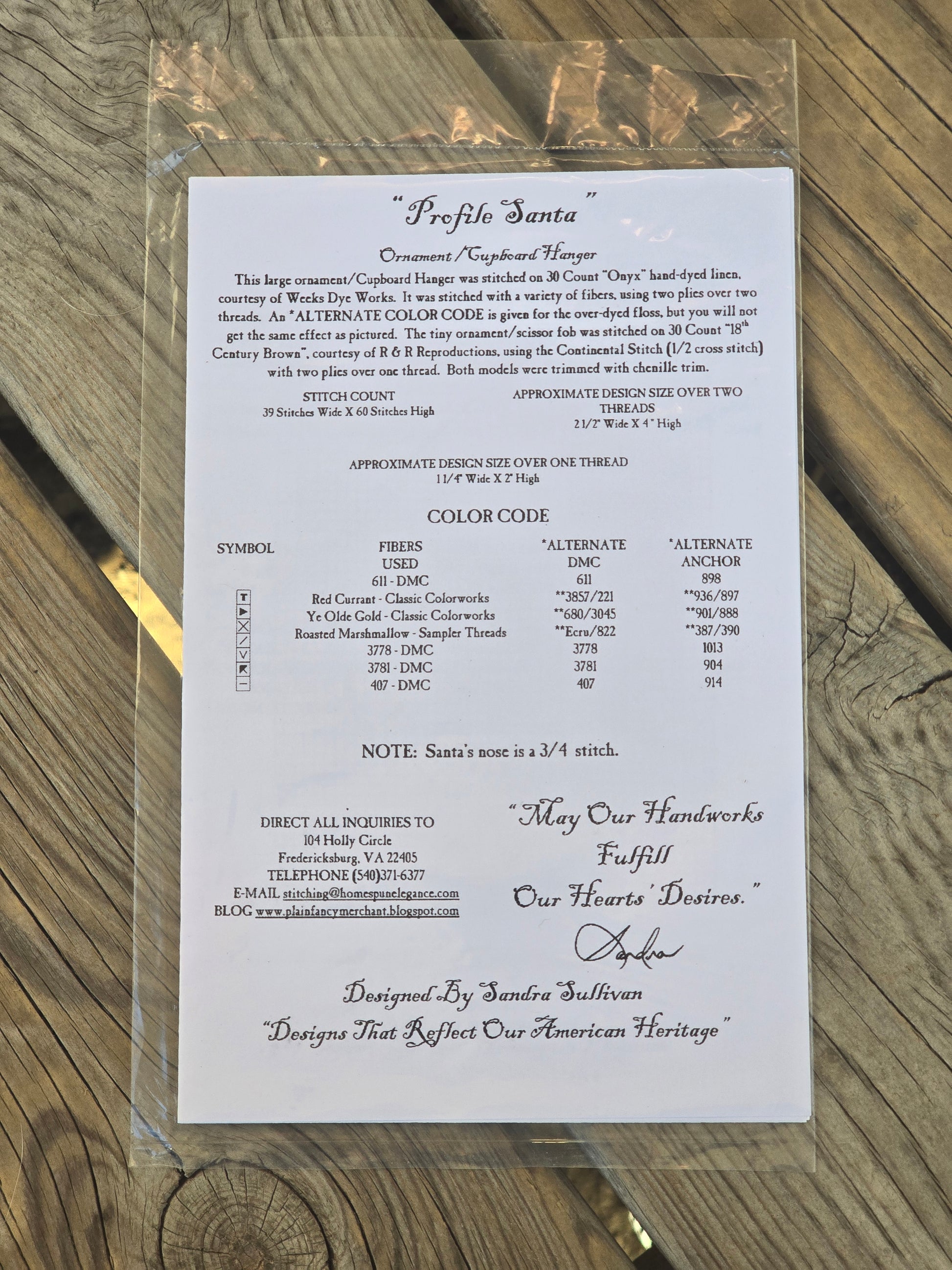 Profile Santa cross stitch pattern. Homespun Elegance. Stitch count: 39w x 60h. Estate find. Sealed in original package.