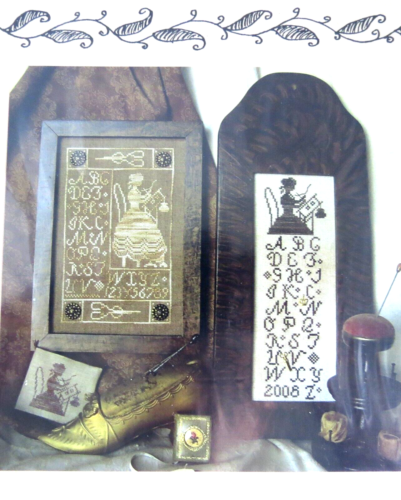 The Stitching Lady cross stitch pattern. Homespun Elegance 2009. Three charts. Button Sampler stitch count: 75W x 115H, approximate design size: 5"W x 7 2/3" H. Vertical Sampler stitch count: 39W x 215H, approximate design size: 2.75"W X 9.75"H. Needle Case stitch count: 92Wx 39H, approximate design size: 5 1/8"W x 2 1/8"H. Estate find. Like new.