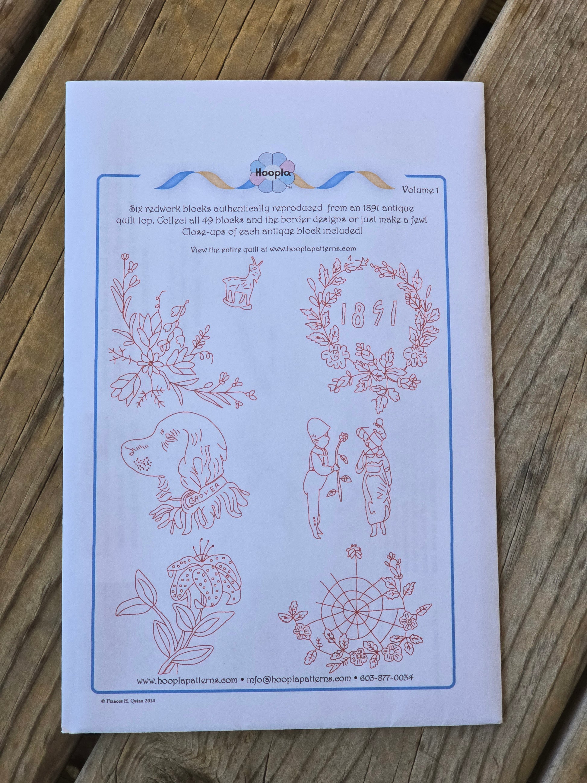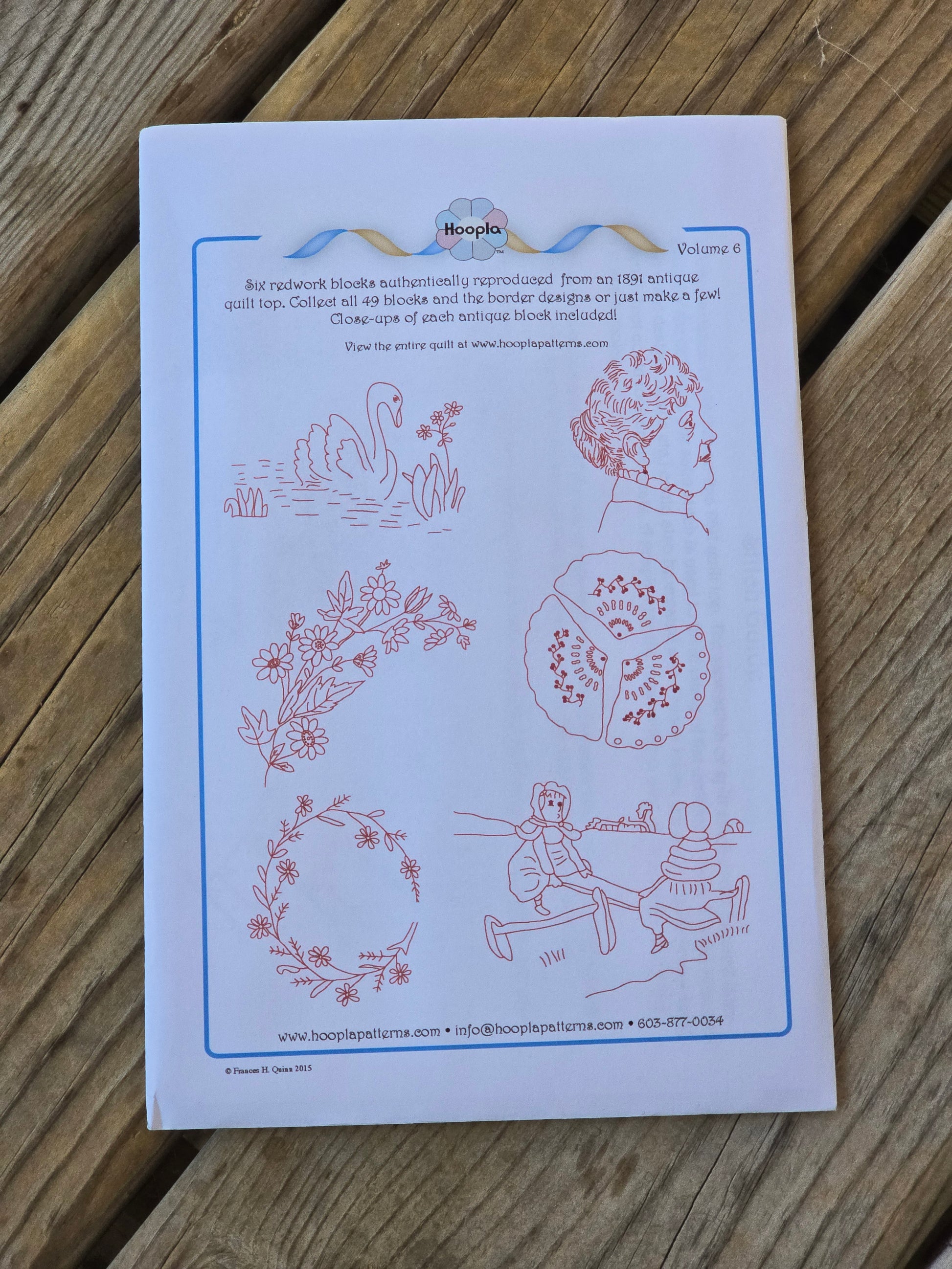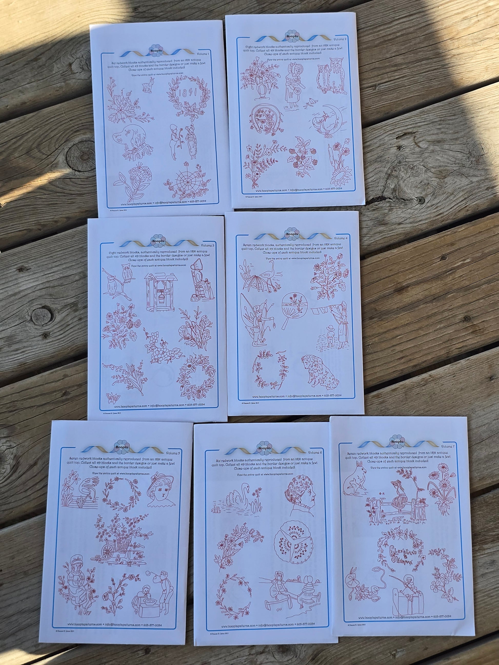 Redwork Blocks, Volumes 1-7, iron on transfer embroidery patterns. Hoopla Patterns 2014-2015. From a retired quilt shop. New in original package. This is set of 7 packages.