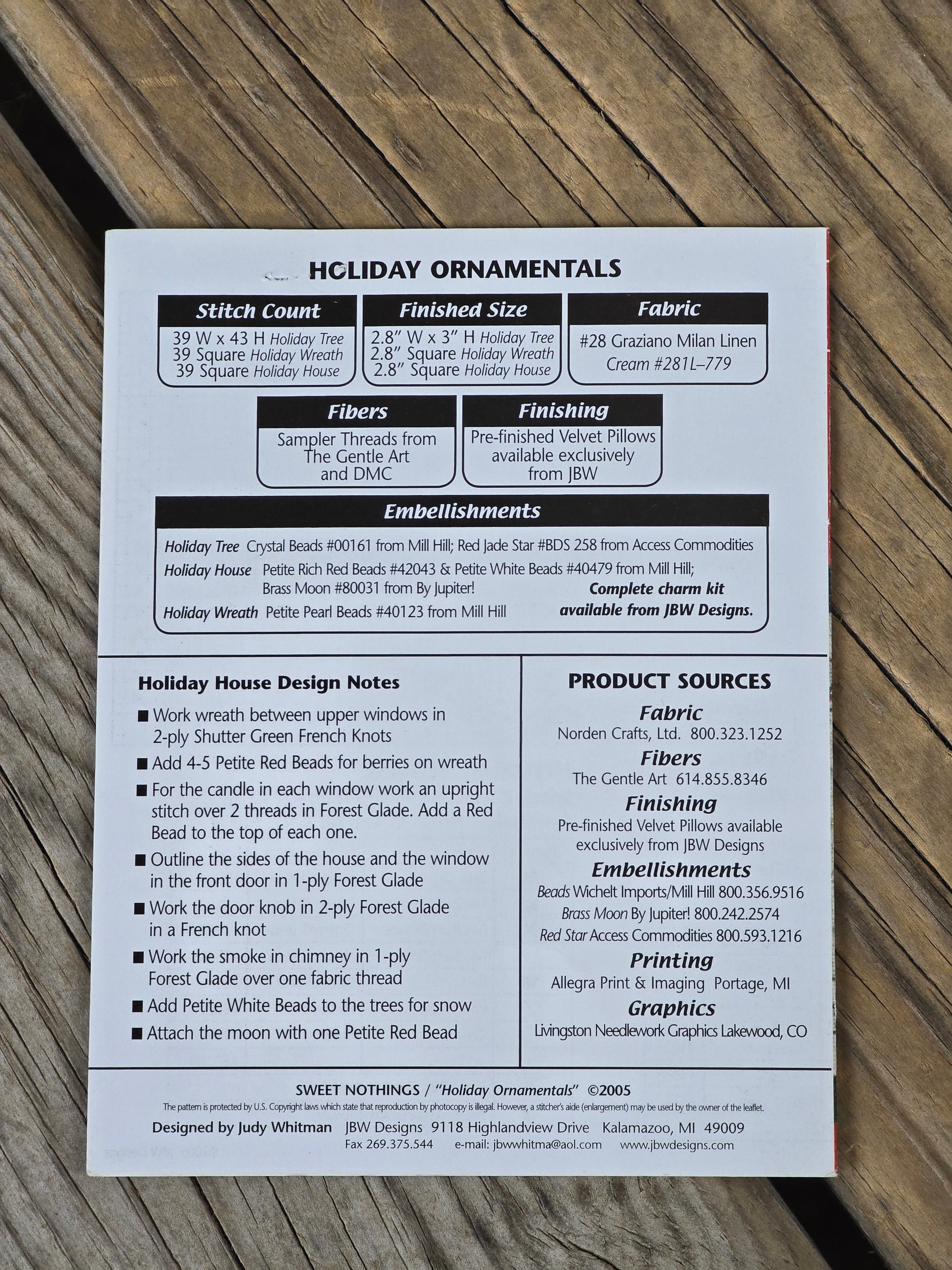 Holiday Ornamentals cross stitch pattern. JBW Designs 2005. Stitch count: tree 39w x 43h, wreath 39w x 39h, house 39w x 39h. Estate find. Used condition. May have slight wear on edges. Does not include button.