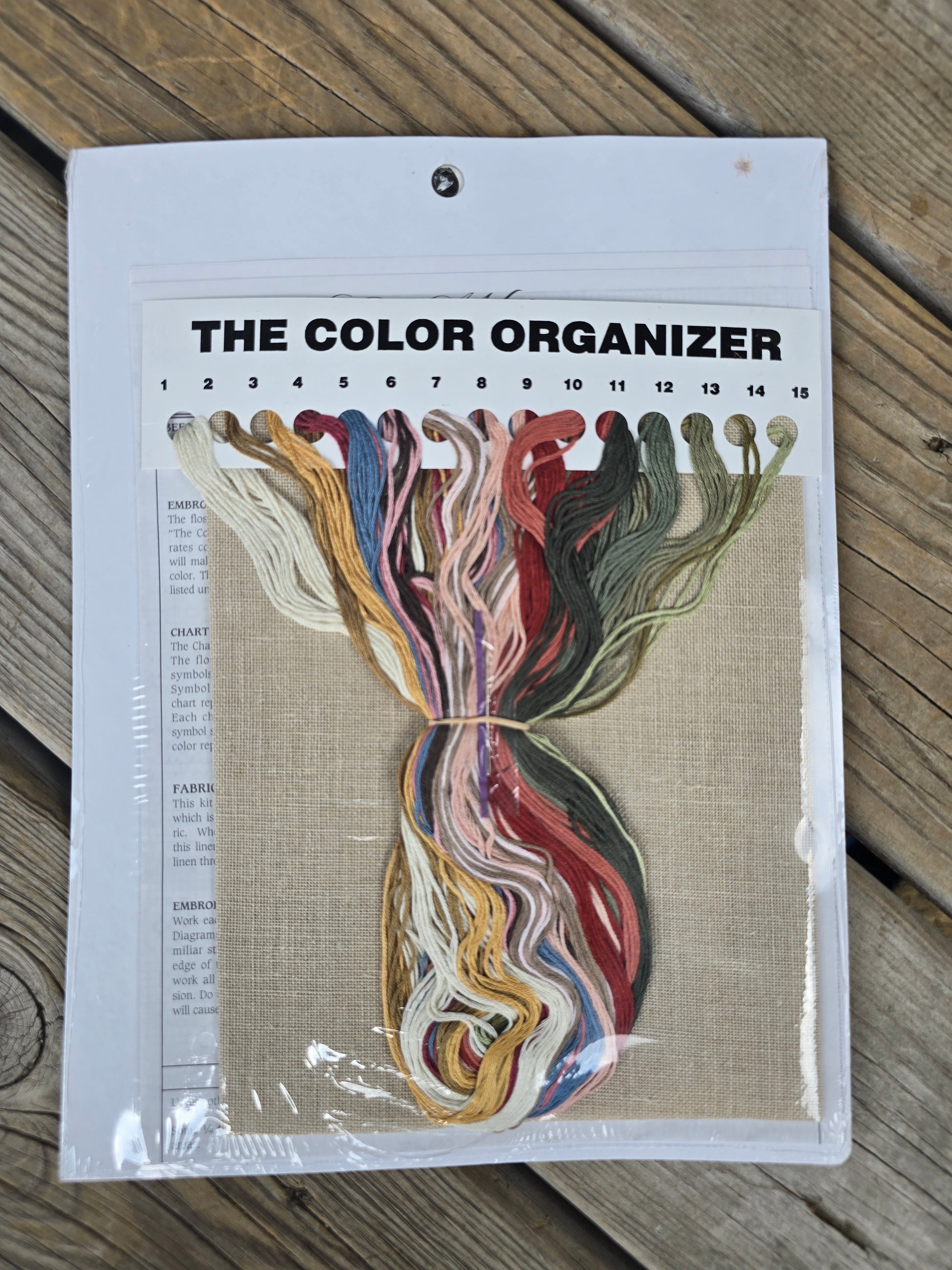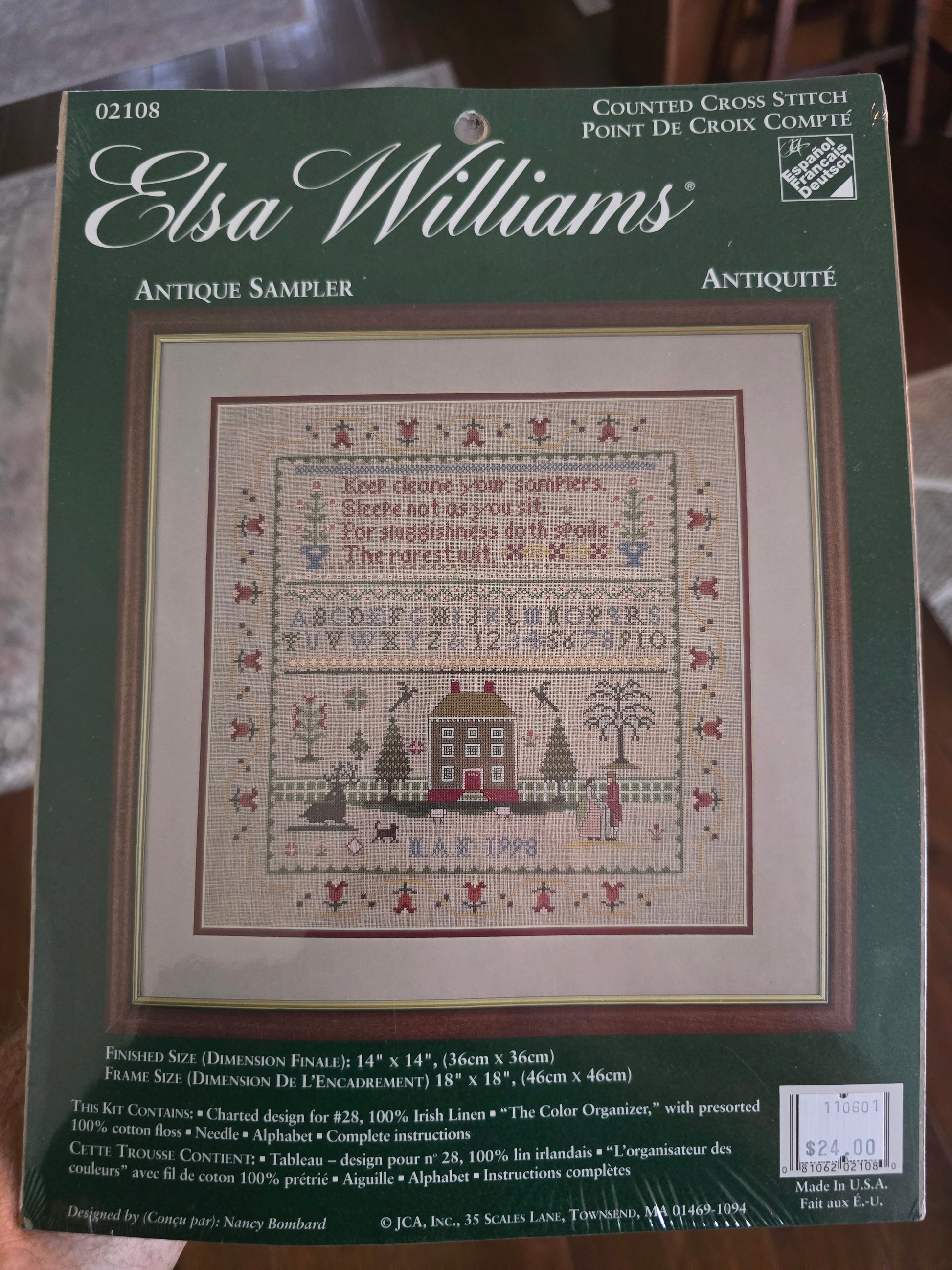 Elsa Williams antique sampler kit. JCA, Inc 1998. Kit includes chart, linen, floss with organizer, needle, alphabet and instructions. Finished size: 14" x 14". Estate find. Like new in sealed package.