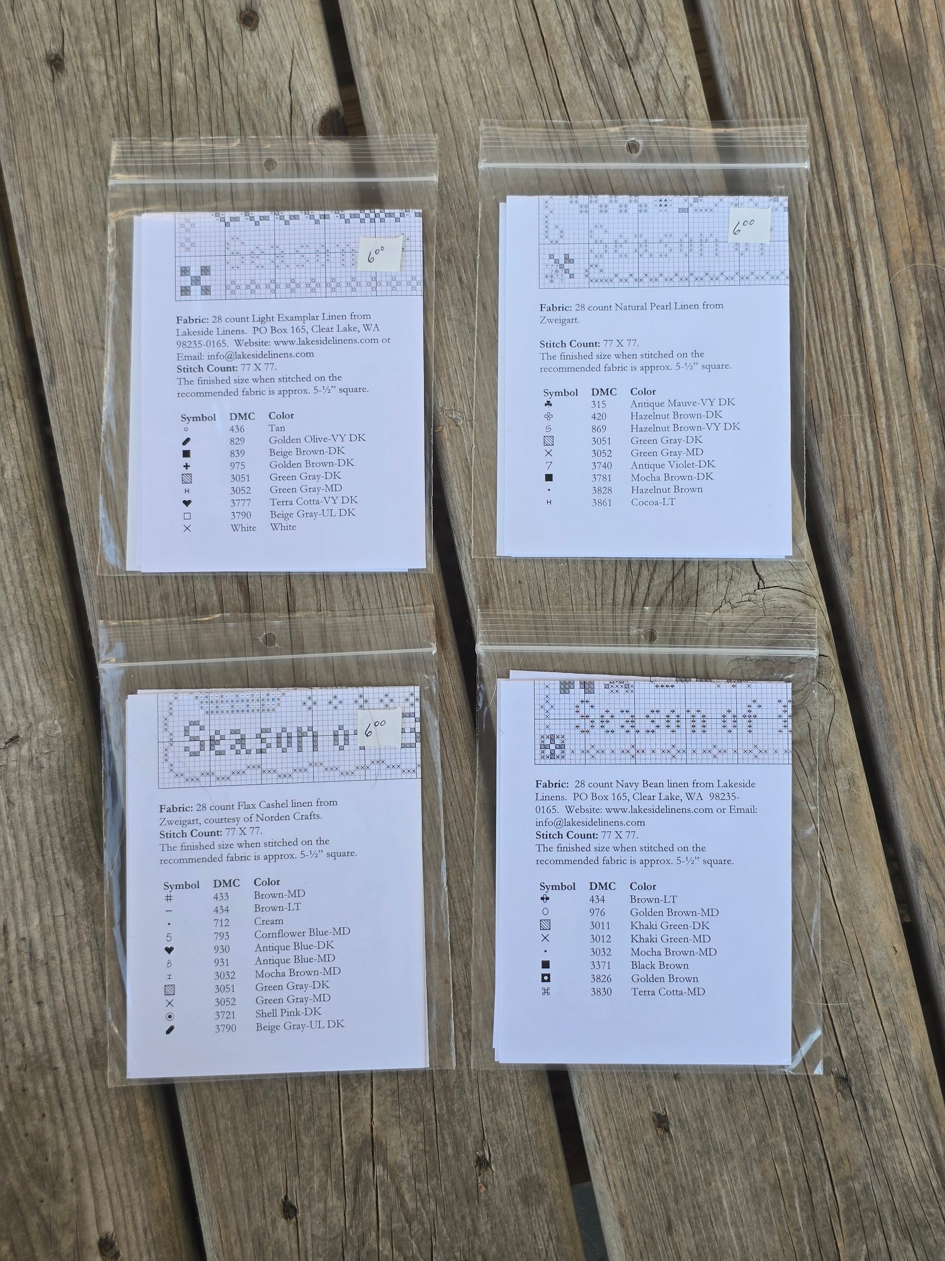 Season of Rest, Hope, Growth and Plenty, set of 4, cross stitch patterns. Little House Needleworks 2005 and 2006. Stitch count: 77 x 77. Estate find. Like new in original package.