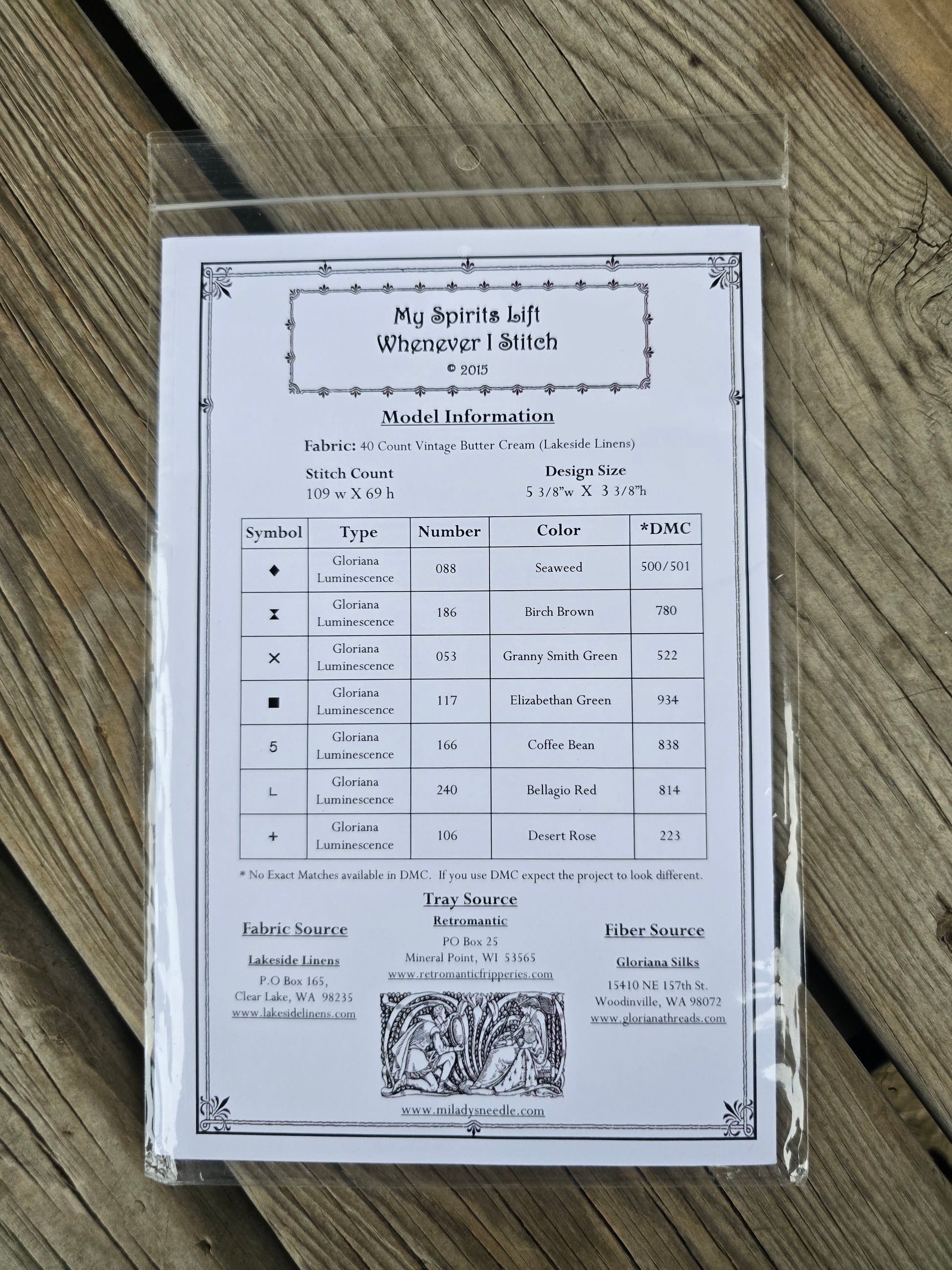 My Spirits Lift Whenever I Stitch cross stitch pattern. Milady's Needle 2015. Stitch count: 109w x 69h. Estate find. Like new in package. Appears unused.