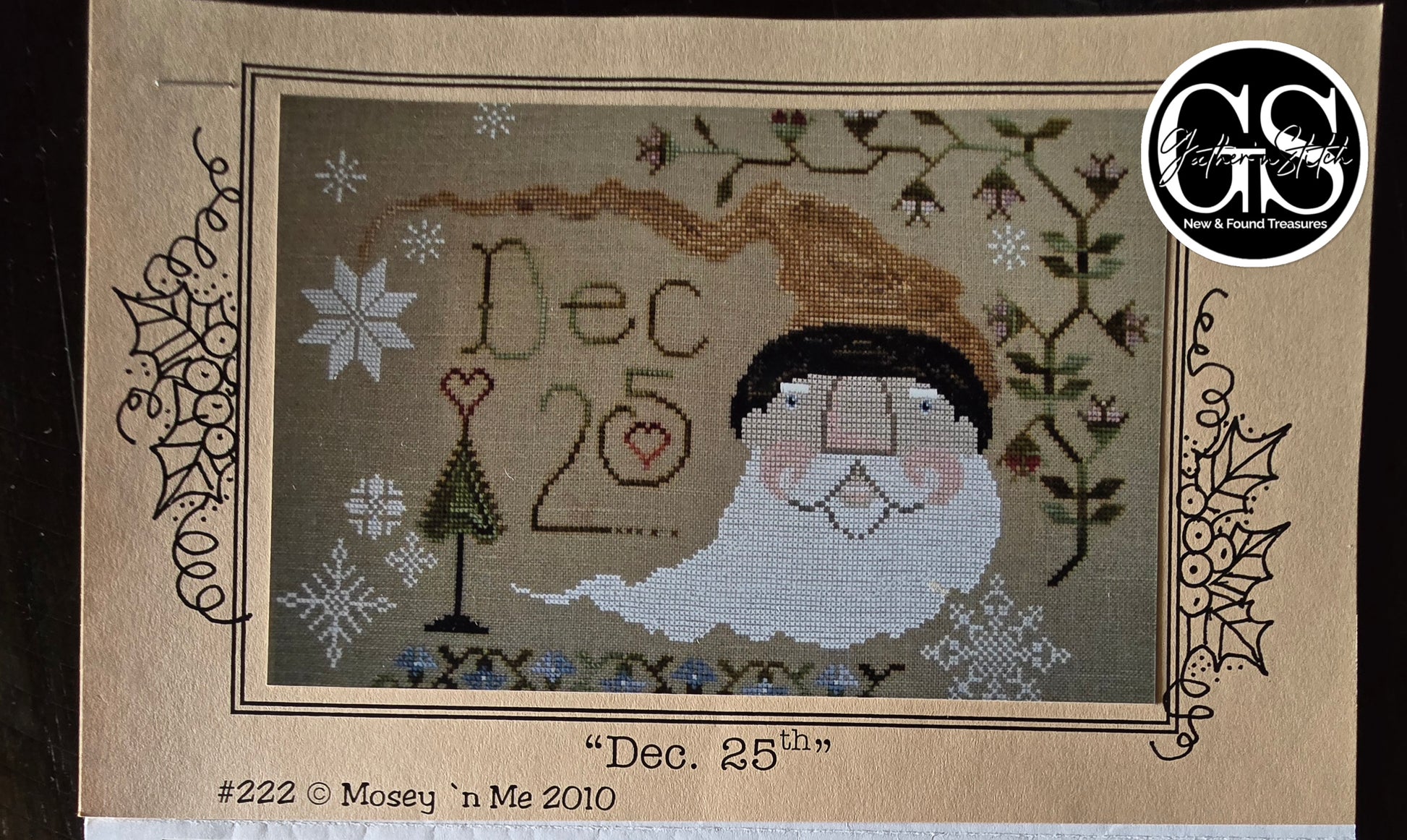 Dec. 25th cross stitch pattern. Mosey 'N Me 2010. Stitch count 177W x 125H. Worked area: 10"W x 8"H. Estate find. Cover stapled to chart. Good condition.