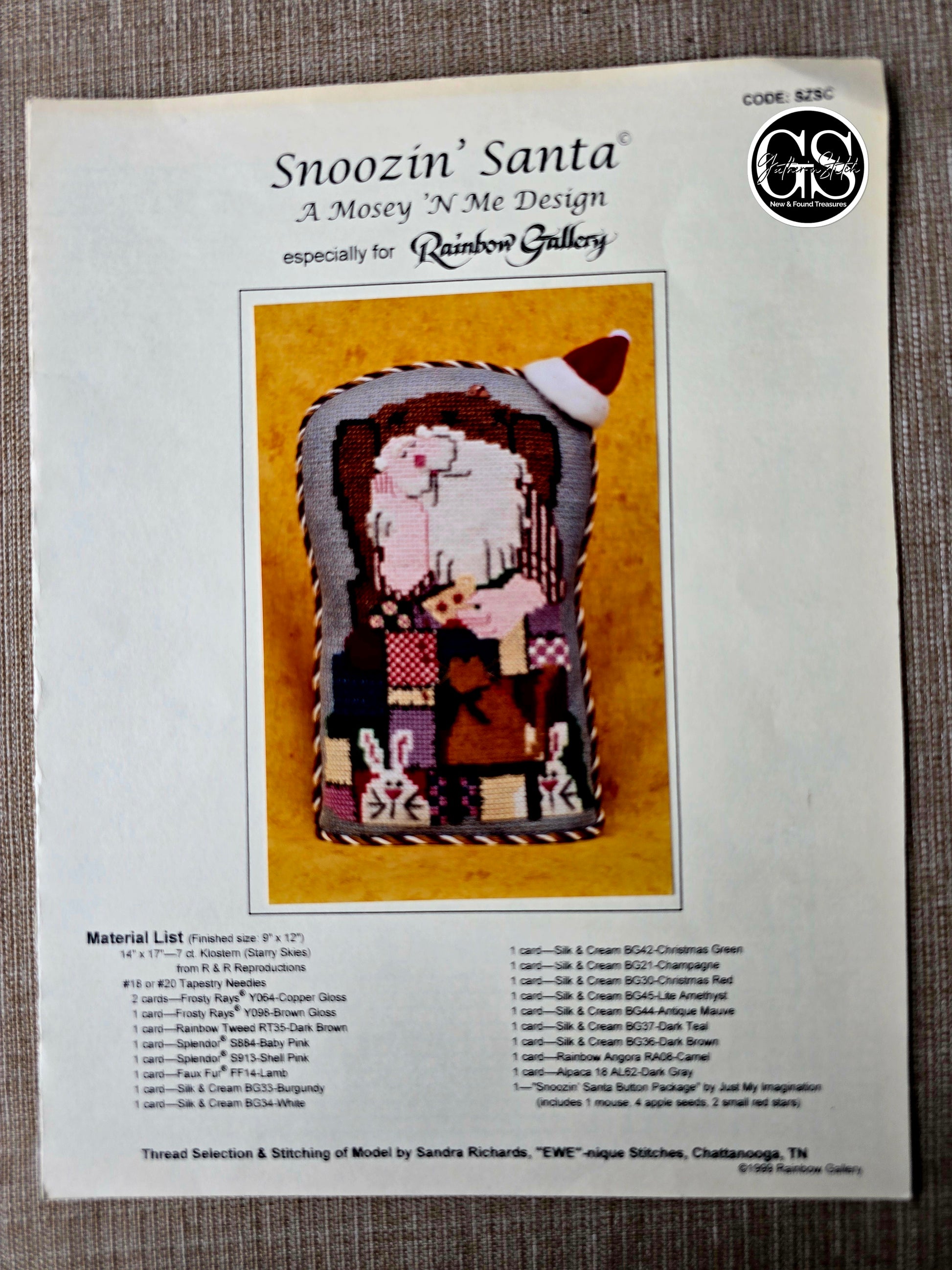 Snoozin' Santan cross stitch pattern. Mosey 'N Me 1999. Finished size: 9" x 12". Estate find. Good condition. Wrinkle at top.