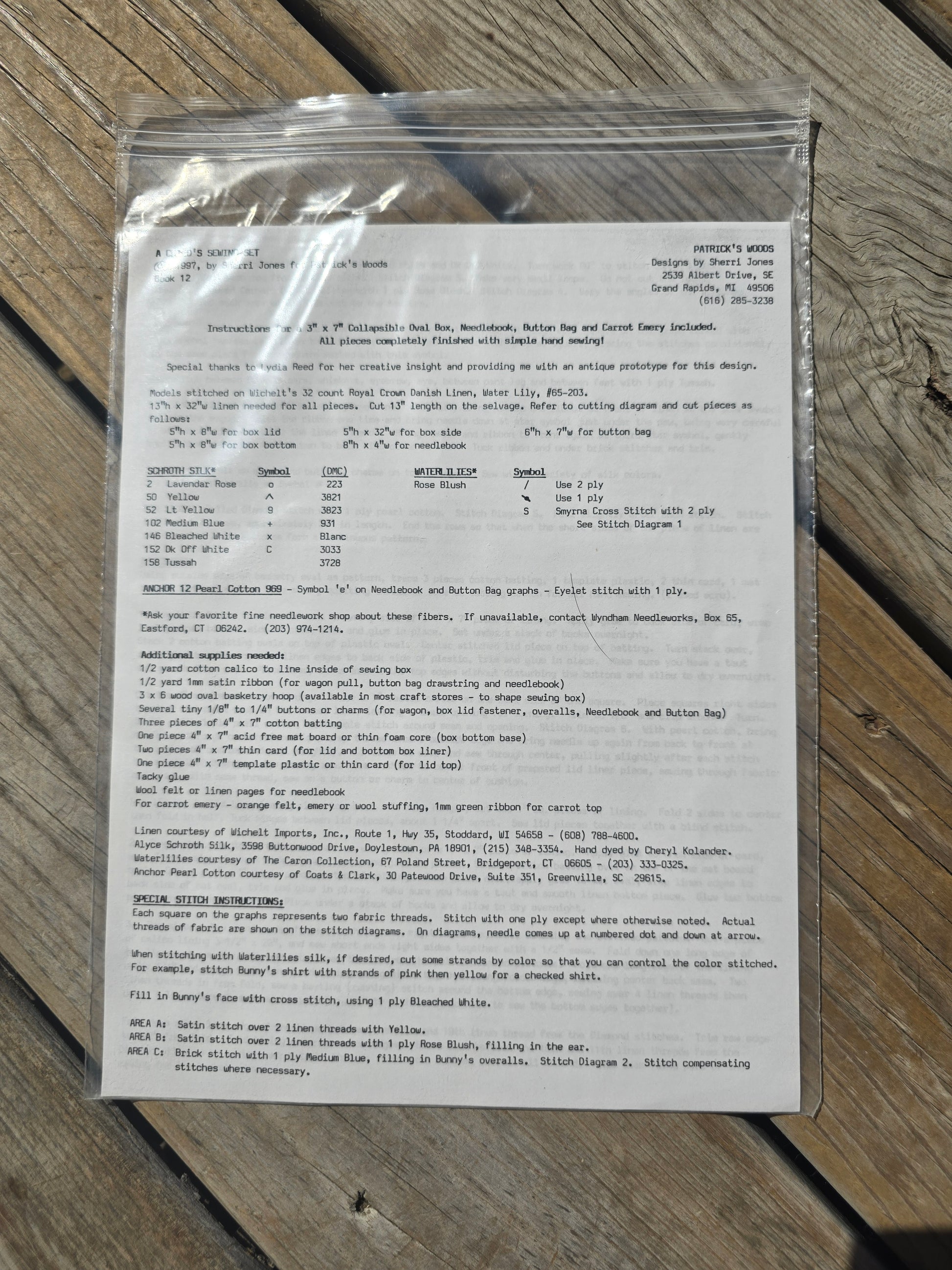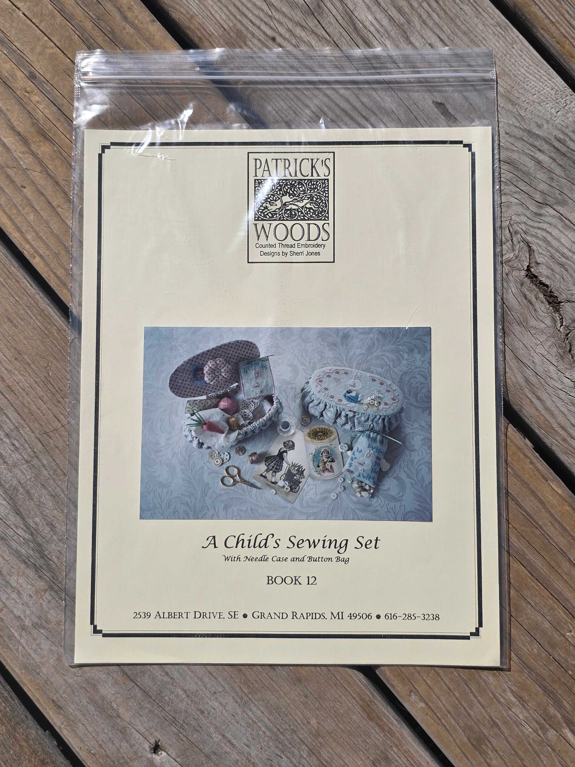 A Child's Sewing Set cross stitch pattern. Patrick's Woods 1997. No stitch count in pattern. Estate find. Like new in original package.