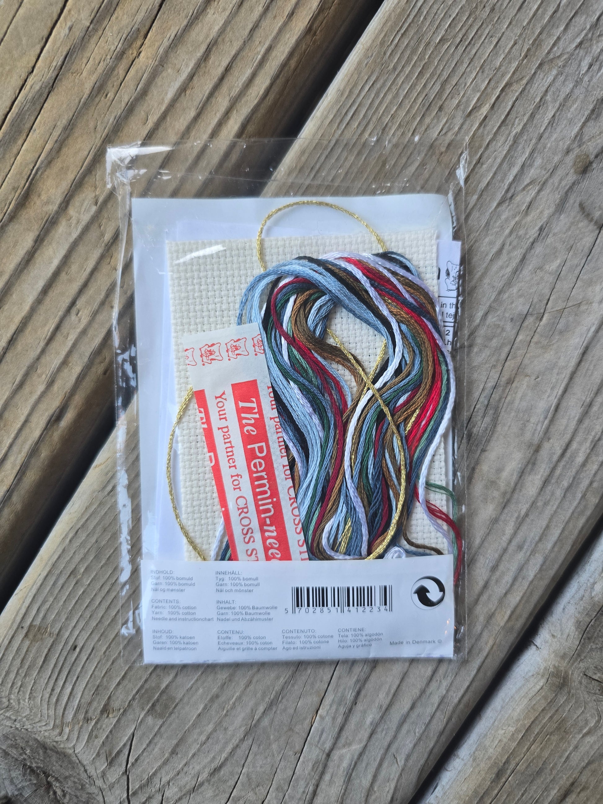 Santa at the Front Door cross stitch kit. Permin of Copenhagen. Kit includes chart, cloth, floss and needle. Estate find. Good condition.