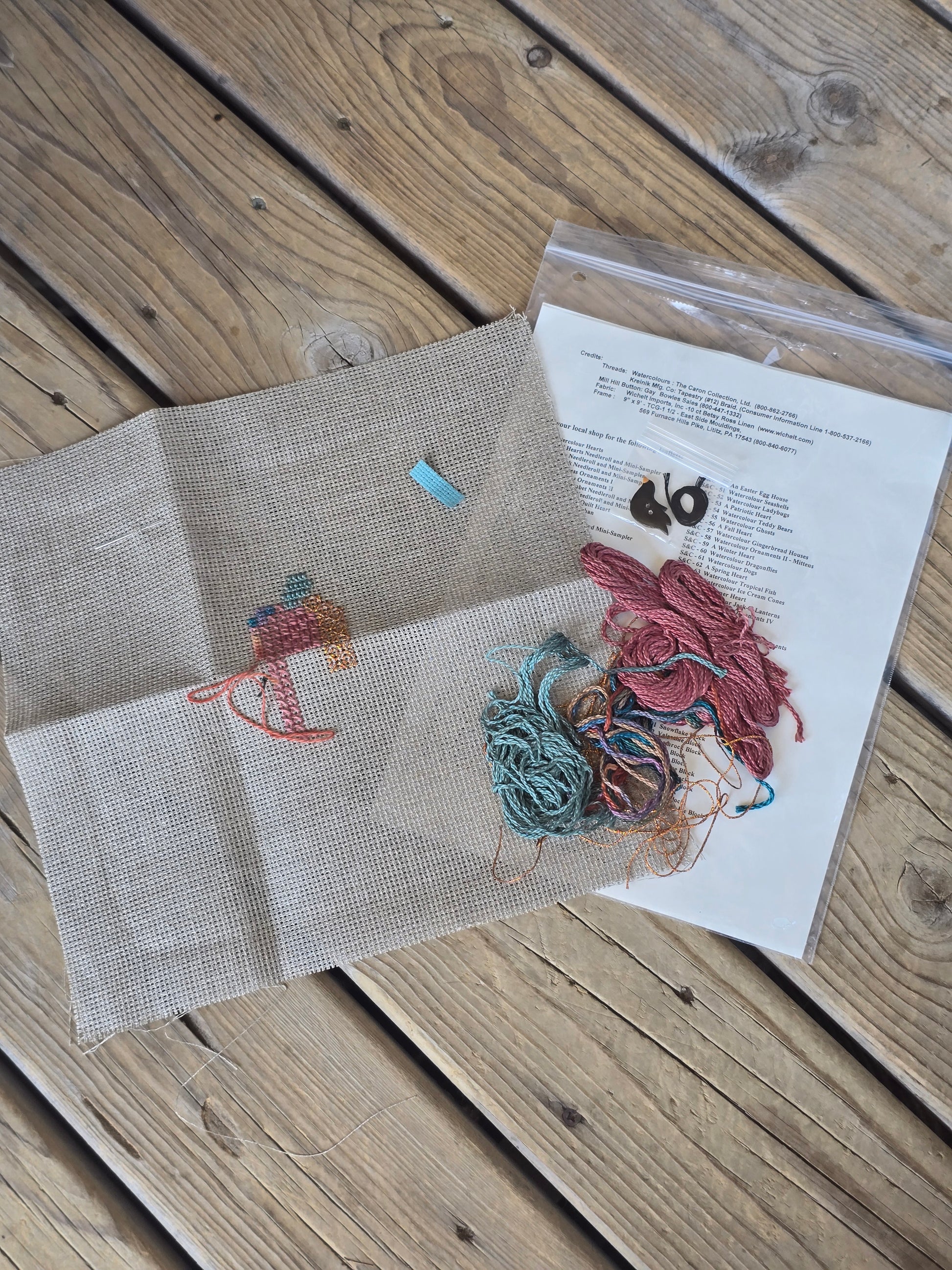 Pumpkin Square cross stitch kit. Sekas & Co 2001. Stitch count: 70 x 70. Kit includes chart, cloth, floss, needle and button. Cloth size 12” x 12”, stitch size 2” x 4”. Stitching has been started. Chart cover is signed by Sue Stihle. Estate find. Used condition.