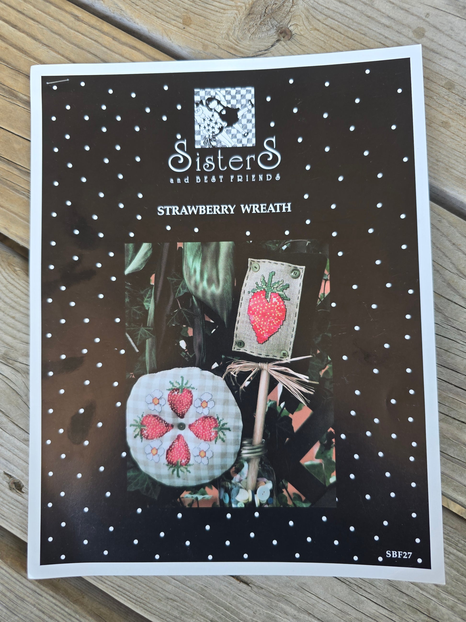 Strawberry Wreath cross stitch pattern and cloth. Sisters and Best Friends 2004. Wreath stitch count: 100 x 100. Strawberry on stick stitch count: 28 x 41. Cloth size: 12" x 12.75". Estate find. Good condition.