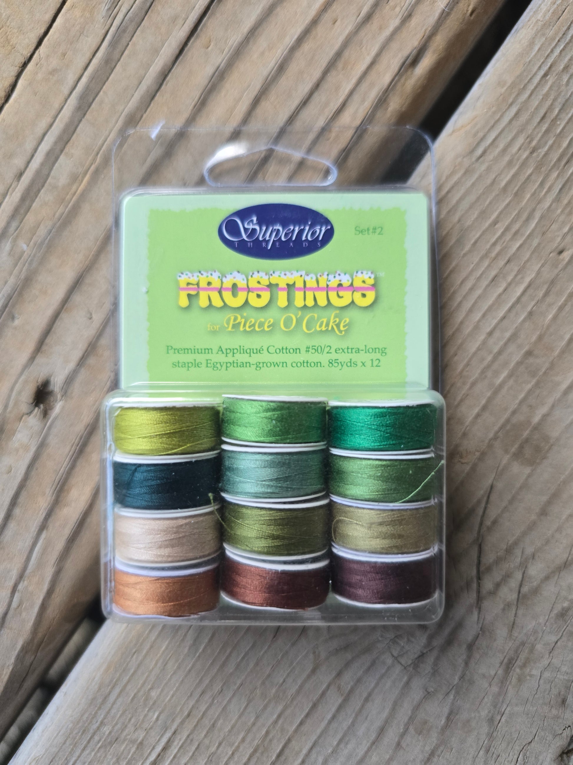 Frostings for Piece O' Cake. Superior Threads. Premium applique cotton #50/2 extra long Egyptian-grown cotton. 85 yards x 12. Designed for quilting, sewing and applique. Known for creating precise stitches, strength and low lint. New, old stock. Like new in original package.
