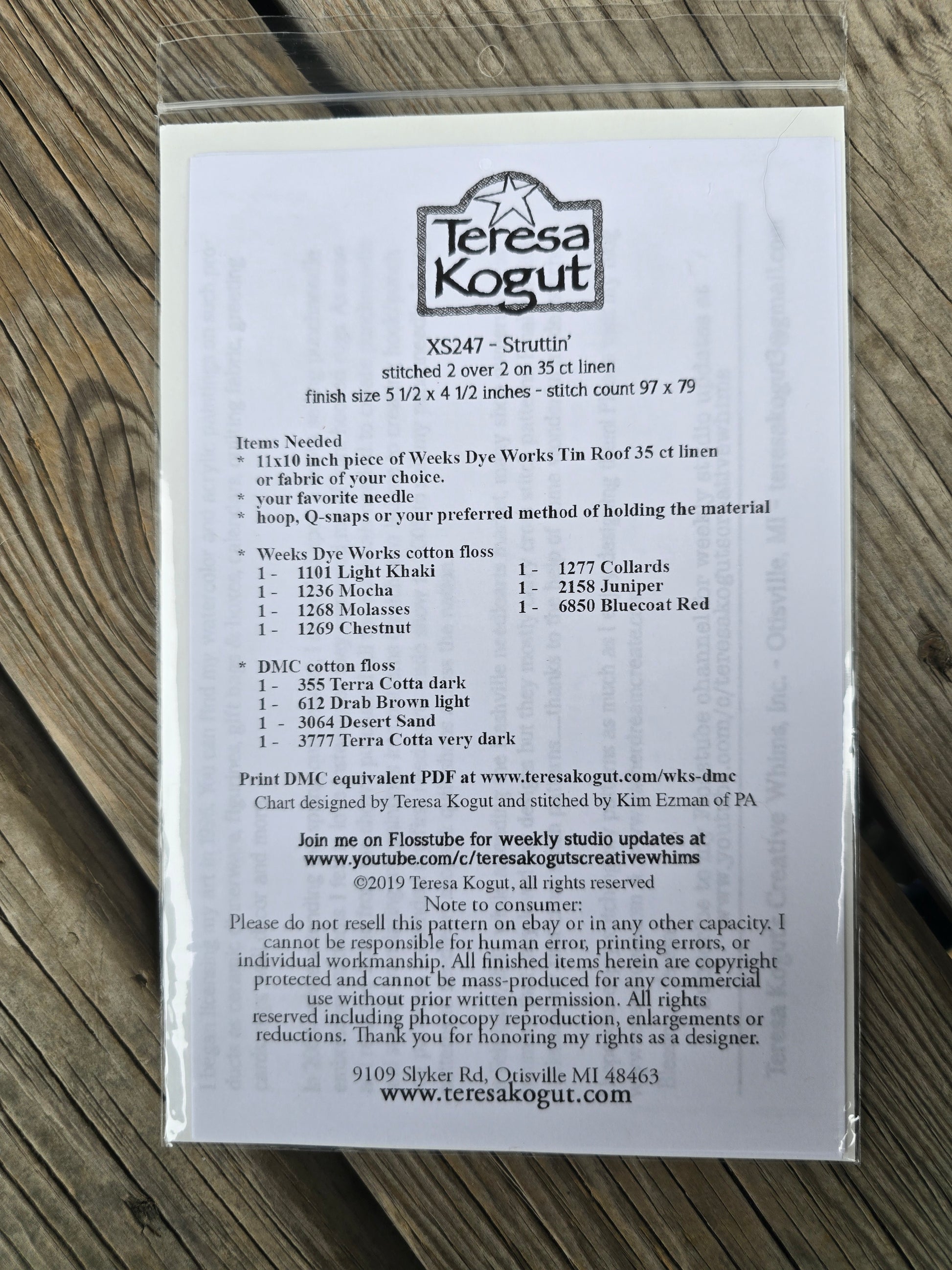 Struttin' cross stitch pattern. Teresa Kogut 2019. Stitch count: 97 x 79. Estate find. Like new in package. Appears unused.