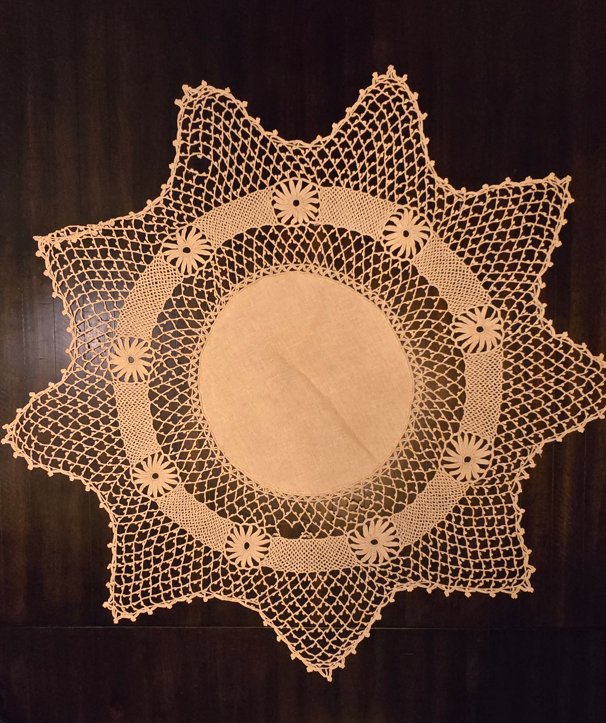 Large round vintage doily. Approximately 34” round, at tip. Estate find. Used condition. Noticeable holes in the lace portion of the doily.