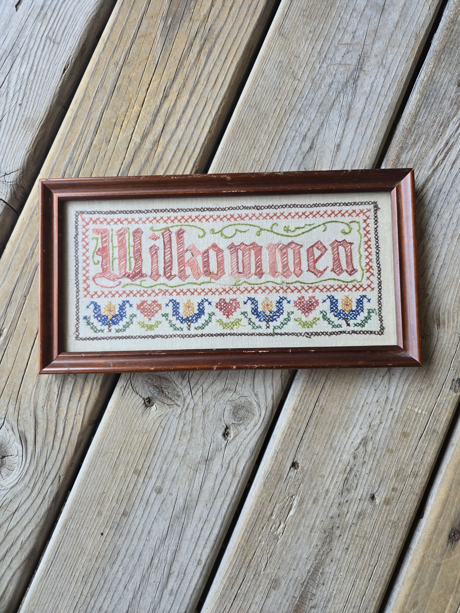 Framed completed cross-stitch sampler featuring the word "Wilkommen," which means "Welcome" in German. Frame outside edge: 12.5” x 6.5”. Estate find. Good condition.