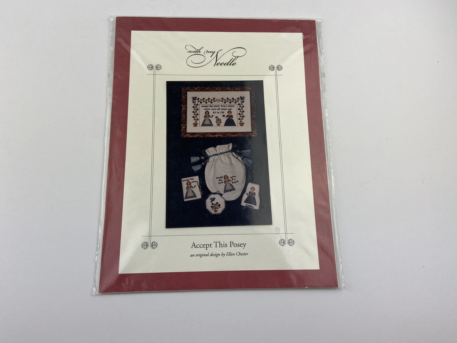Accept This Posey cross stitch pattern. With My Needle 2002. Sampler stitch count: 123W x 72H. Sampler stitched size: 7 5/8"W x 4 1/2"H. Estate find. Like new in package.