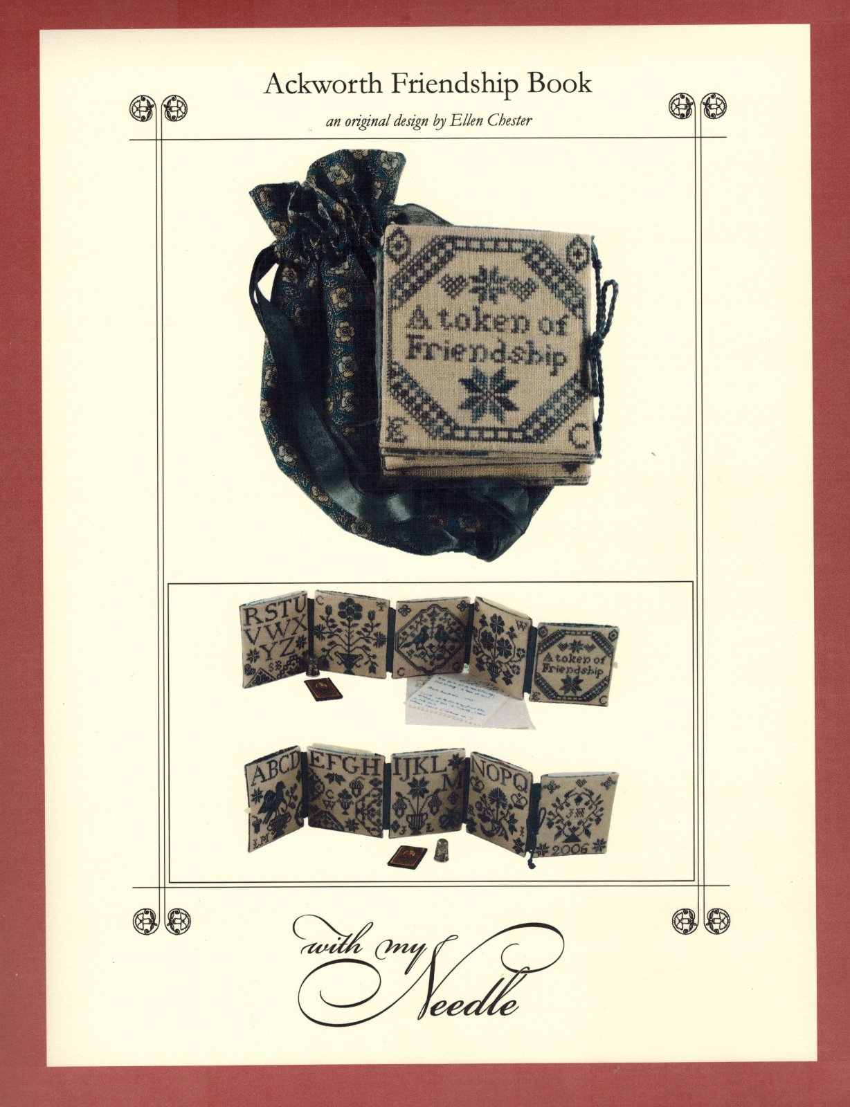 Ackworth Friendship Book cross stitch pattern. With My Needle 2006. Stitch count per page or cover: 61W x 65H. Stitch size per page or cover: 3 3/8"W x 3 5/8"H. Estate find. Like new in package.