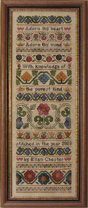 Adorn Thy Heart cross stitch sampler pattern. With My Needle 2003. Stitch count: 111W x 349H. Stitch size: 6 7/8"W x 21 3/4H. Estate find. Like new in package.